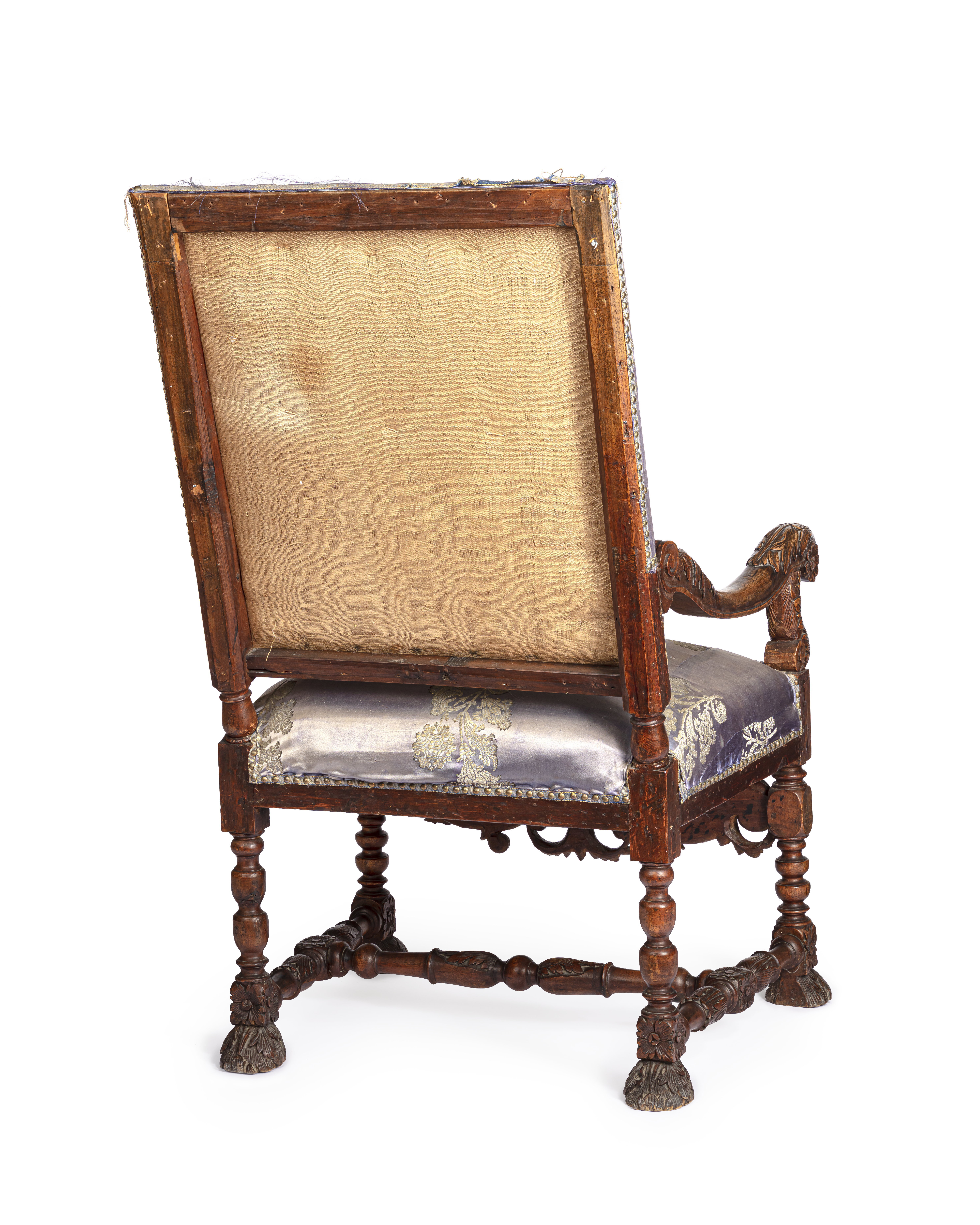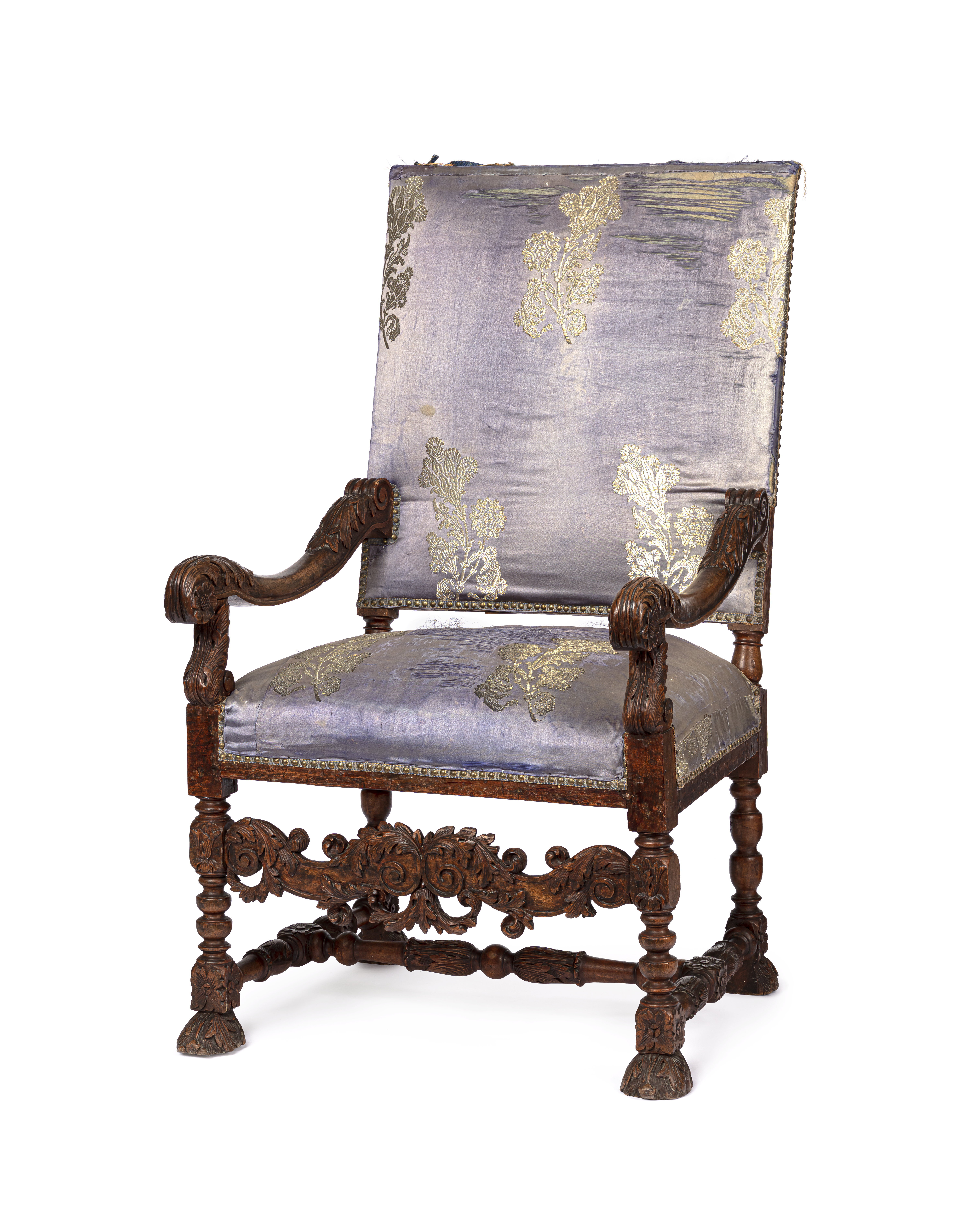 Svarvade ben, slåar och kryss med skurna ornament. Framslå och armstöd med skurna blad- och blomornament. Fyrkantig rygg liksom sitsen stoppad och klädd med blått atlassiden med brocherade stora silverblommor. Tillhörande lapp: Satin Bleu royal med inväfda silfverblommor. Del af en soiréeklädning från Worth i Paris begagnad af Grefvinnan Anna Brahe 1921-1922.