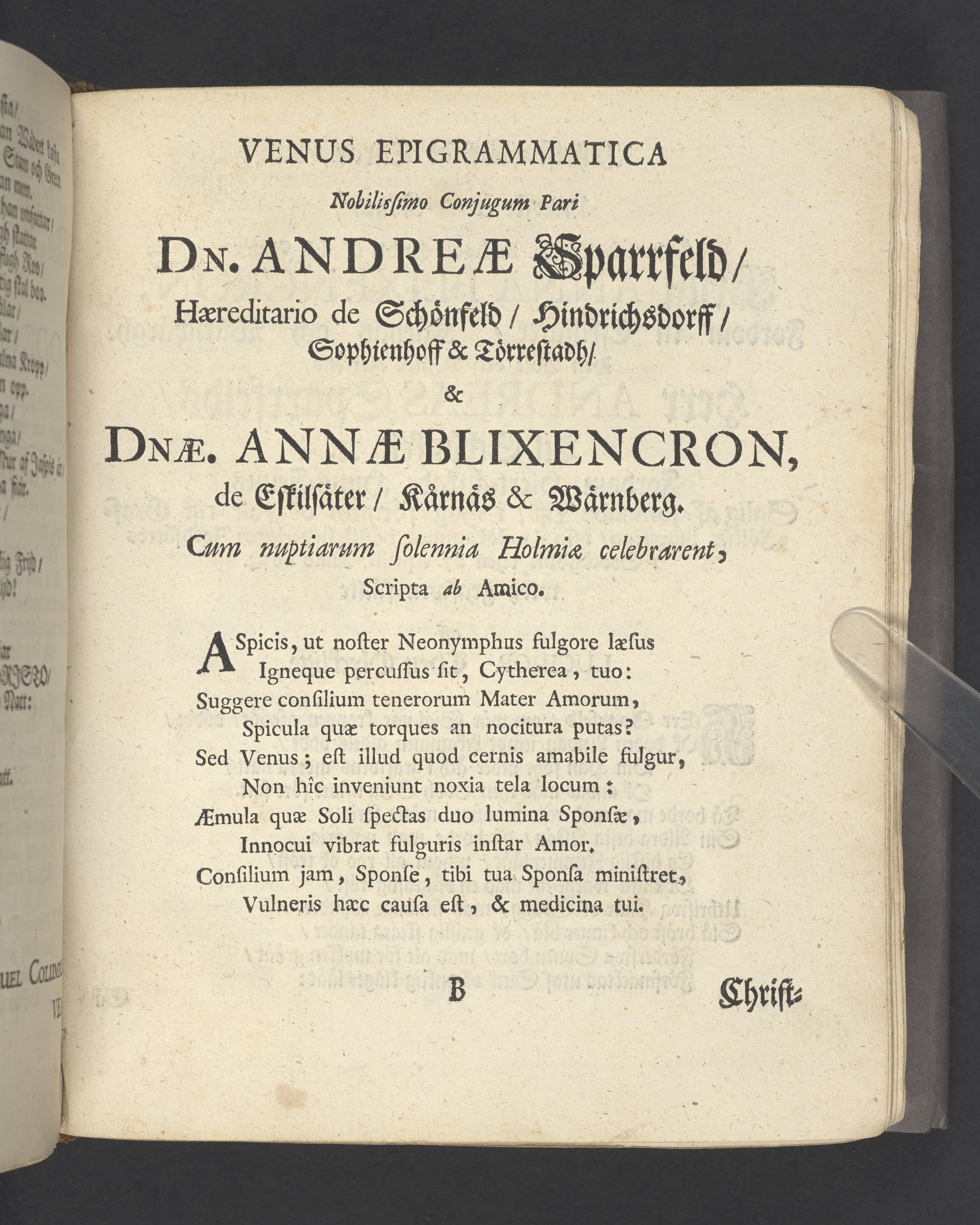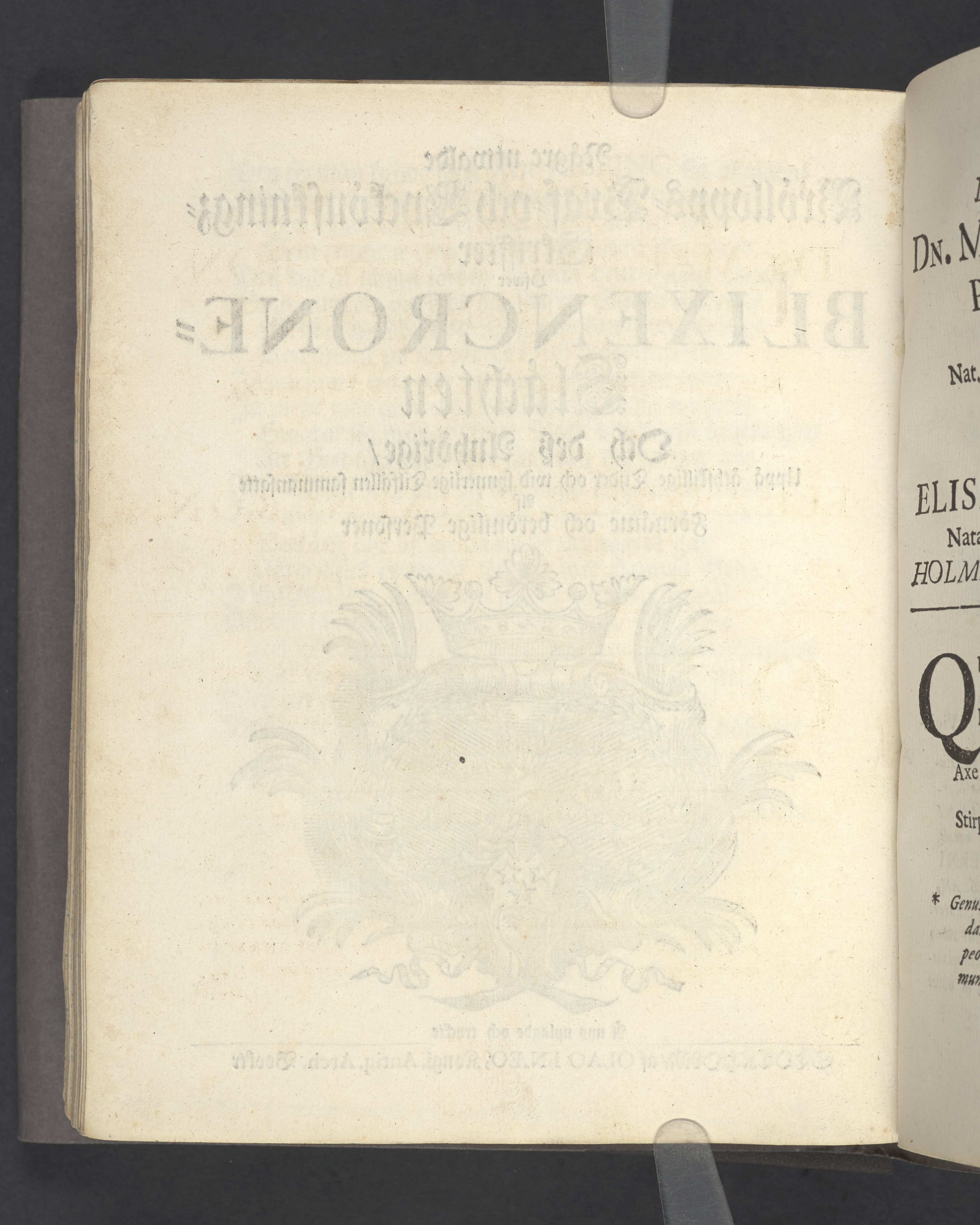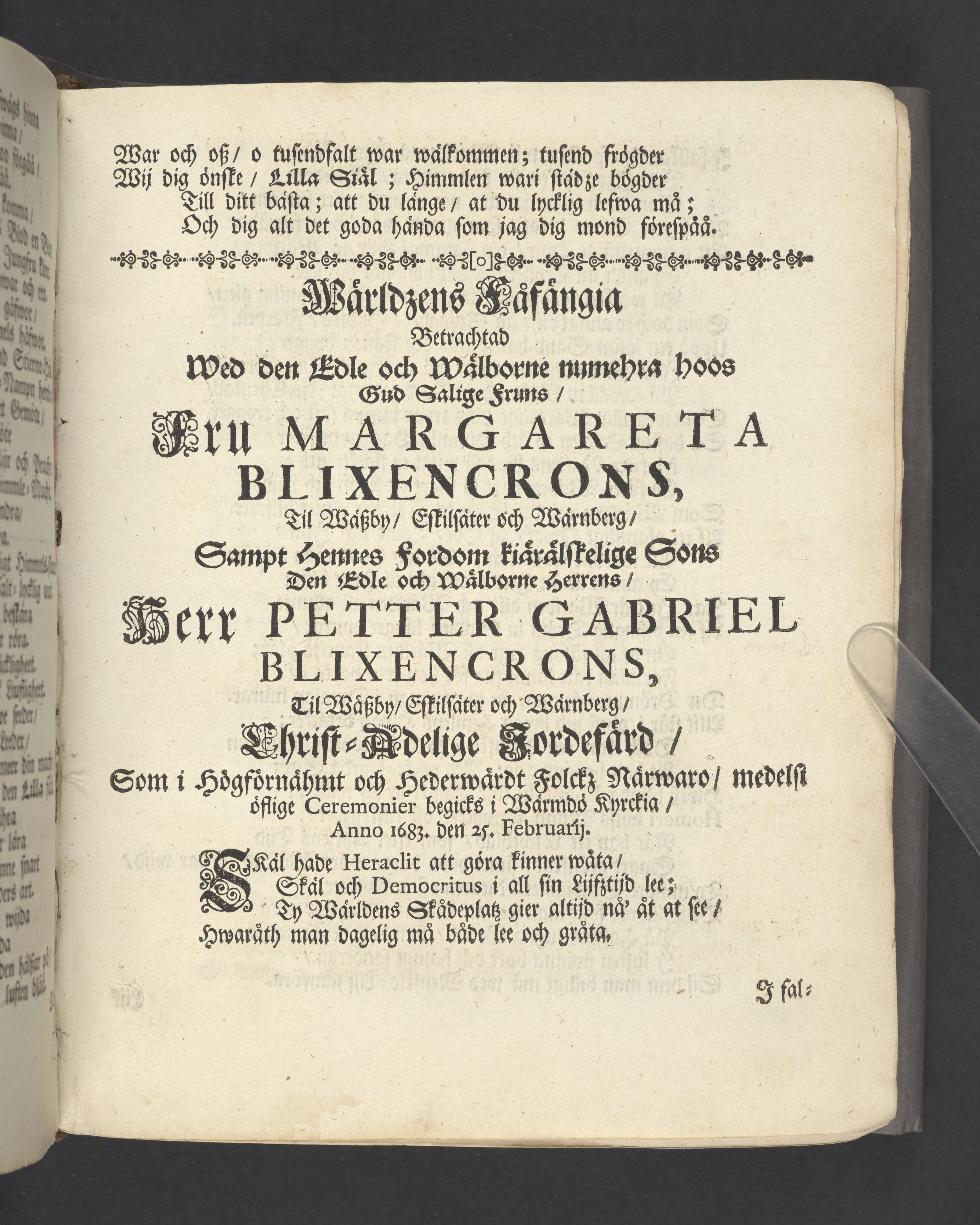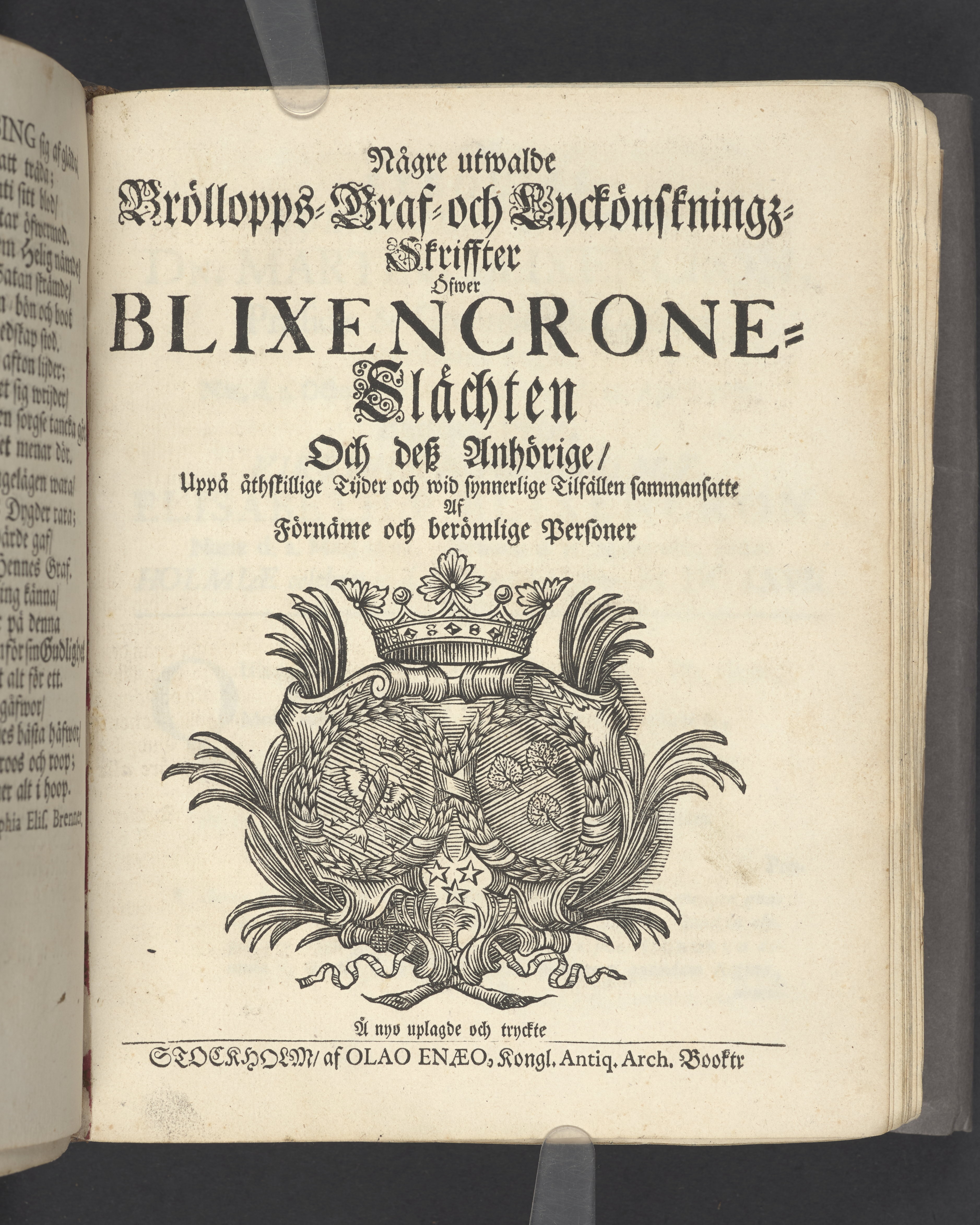 Någre utwalde bröllopps- graf- och lyckönskningz-skriffter öfwer Blixencrone-slächten och desz anhörige, uppå åthskillige tijder och wid synnerlige tilfällen sammansatte af förnäme och berömlige personer. Å nyo uplagde och tryckte Stockholm, af Olao Enæo, kongl. antiq. arch. booktr.