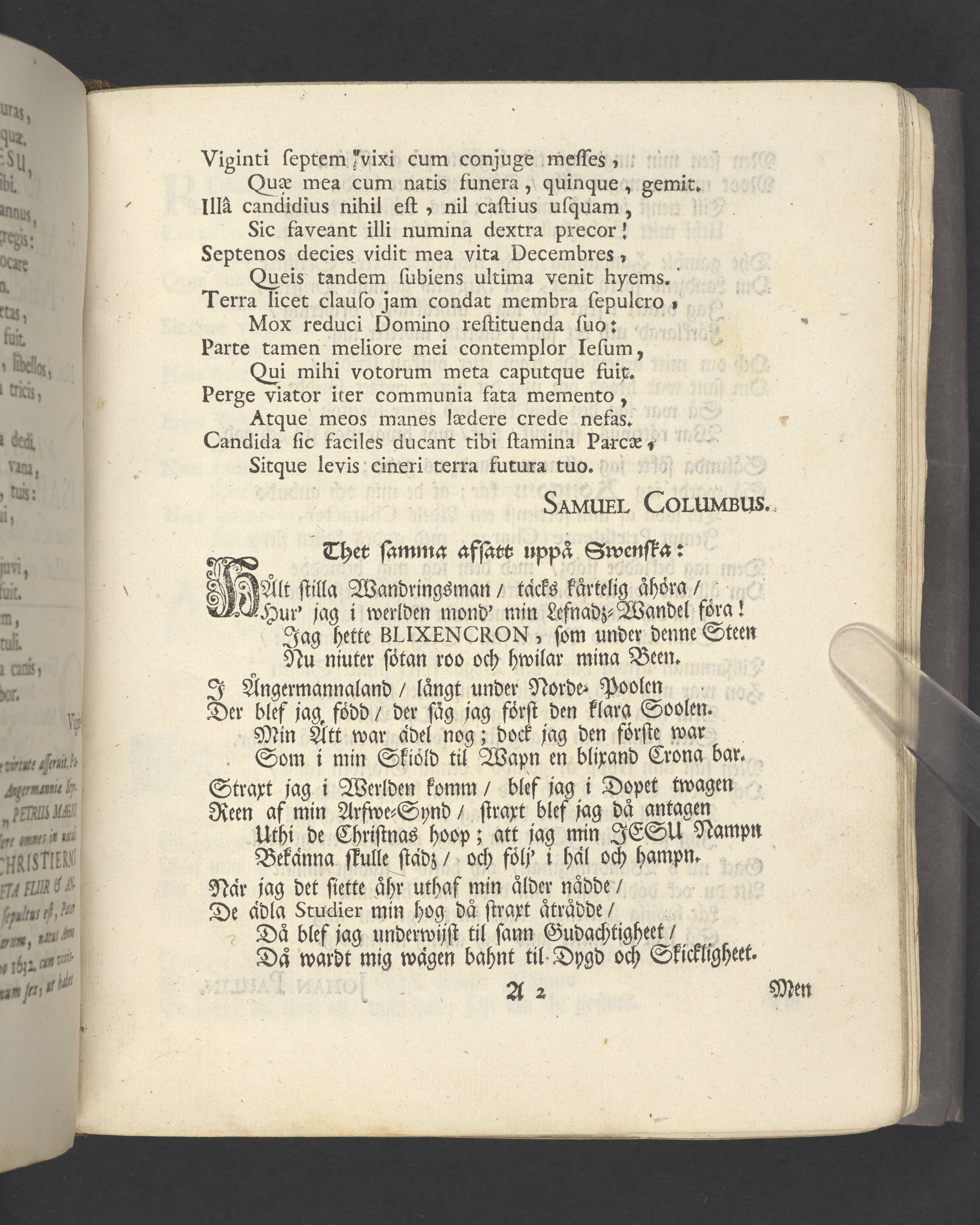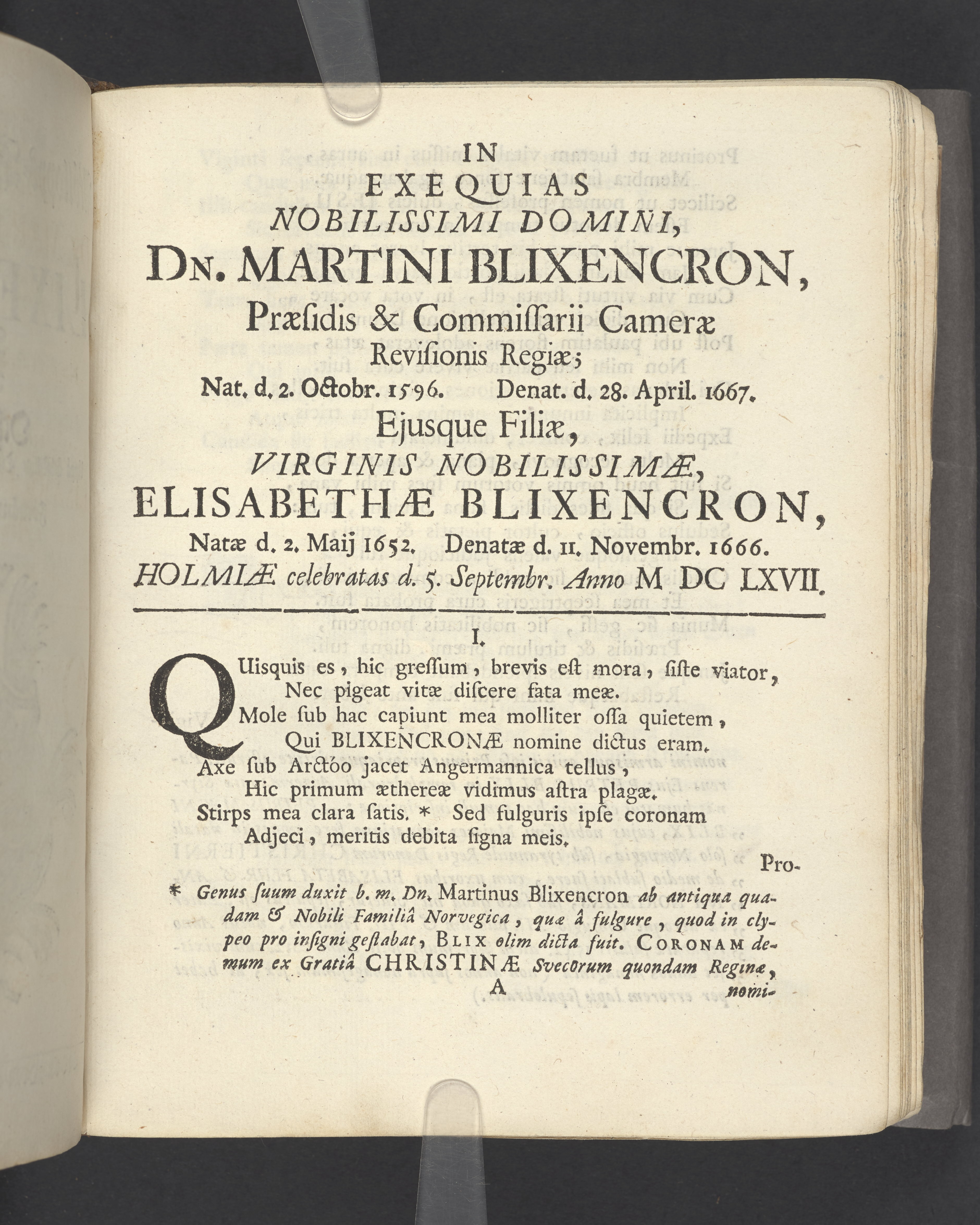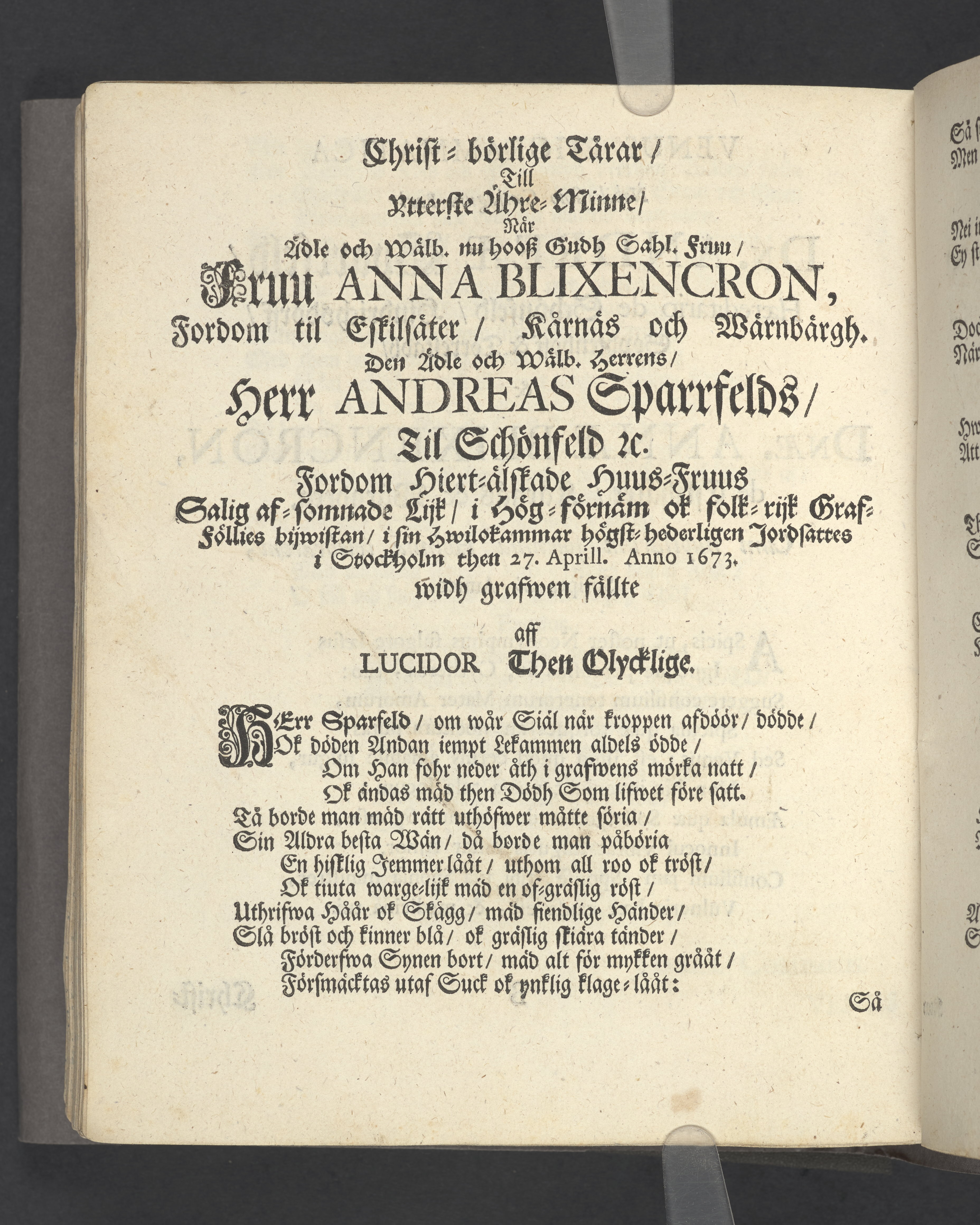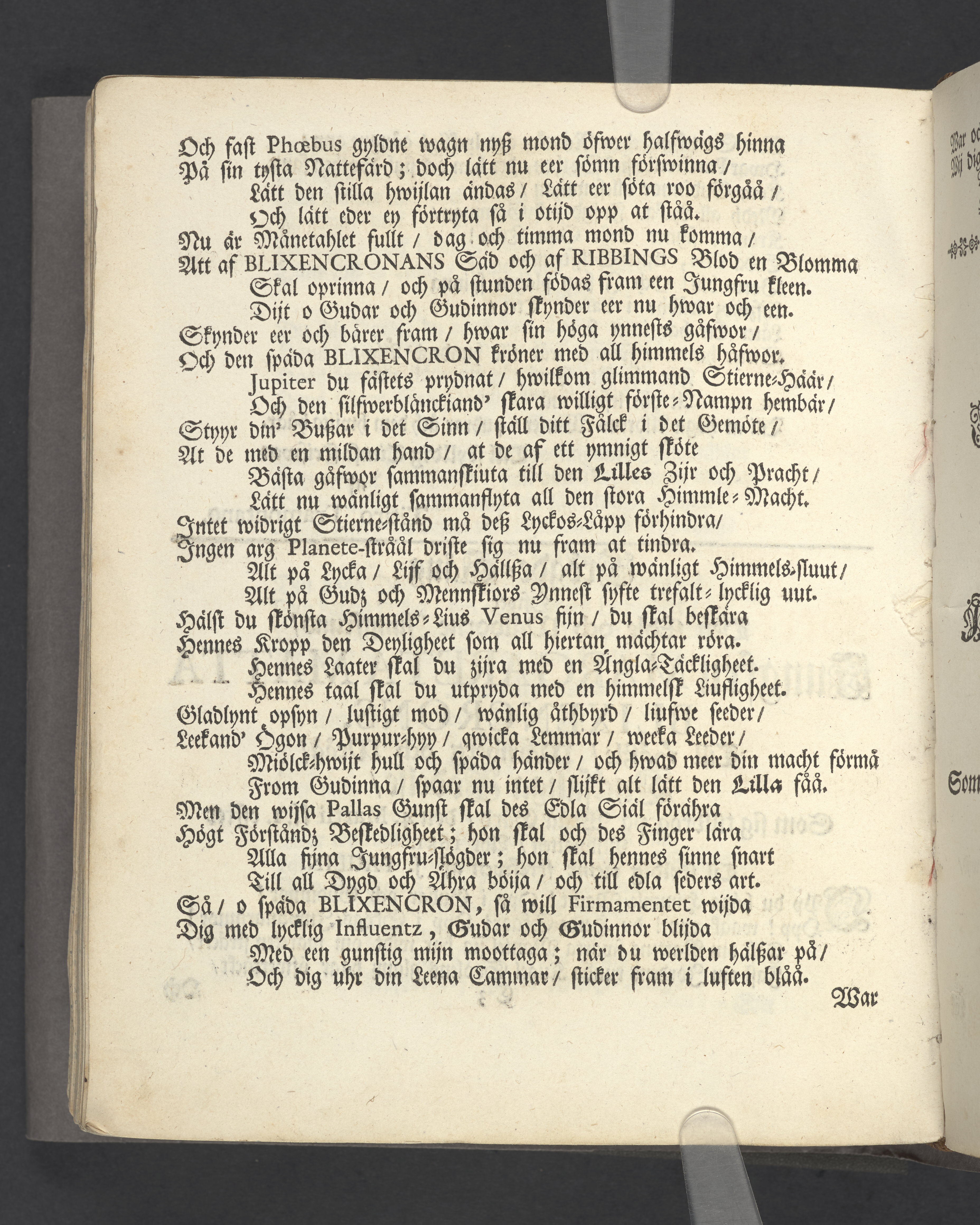 Någre utwalde bröllopps- graf- och lyckönskningz-skriffter öfwer Blixencrone-slächten och desz anhörige, uppå åthskillige tijder och wid synnerlige tilfällen sammansatte af förnäme och berömlige personer. Å nyo uplagde och tryckte Stockholm, af Olao Enæo, kongl. antiq. arch. booktr.