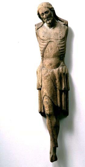 Kondition: armar, krona och kors förlorade, fötterna skadade, ytan vittrad. Färg: endast obetydliga fragment.