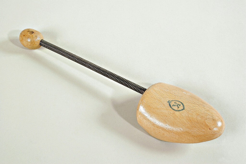 Skoblock med tå sidan av trä. En stålspiral mot klacken som där avslutas i en oval trädel. På tåsidans övre del är en blå stämpel i form av en oval med ett K i mitten.