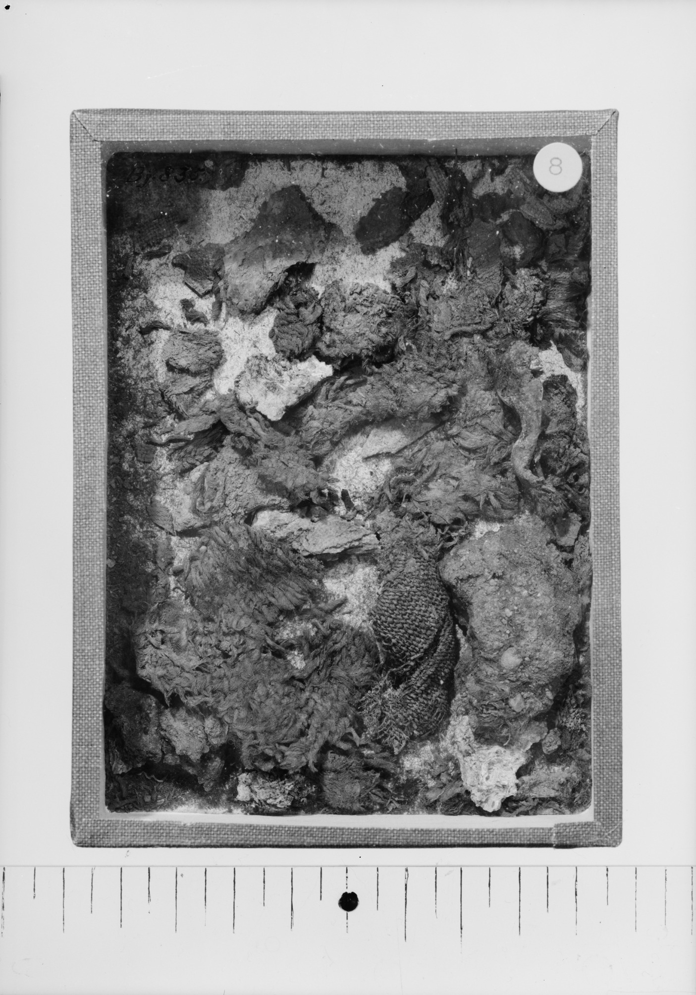 Klumpar och fragment av linnelärft. Yllevävnad, treskaftad kypert och siden.
