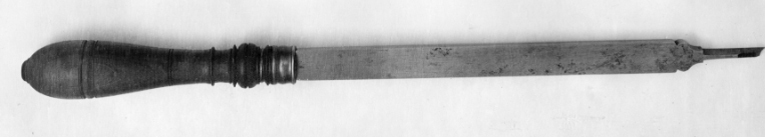 Profilstål med bågformig, konkav, snedställd egg framtill och rak egg på sidorna. Klinga med rektangulärt tvärsnitt. Övergången mellan stål och klinga med kornischformig kontur på båda sidor. Svarvat, profilerat kägelformigt skaft, dekorerat med svarvade ringar och en rad vulster vid fästet. Skaftet avslutas med en flat knopp. Fästet är skott med en profilerad mässingsring. Mått: L: 439 mm, skaftl: 160 mm, största diam: 34,7 mm, eggb: 5,1 mm Stämpel: IK under krona samt 1,5 mm däröver P, proberstämpel?