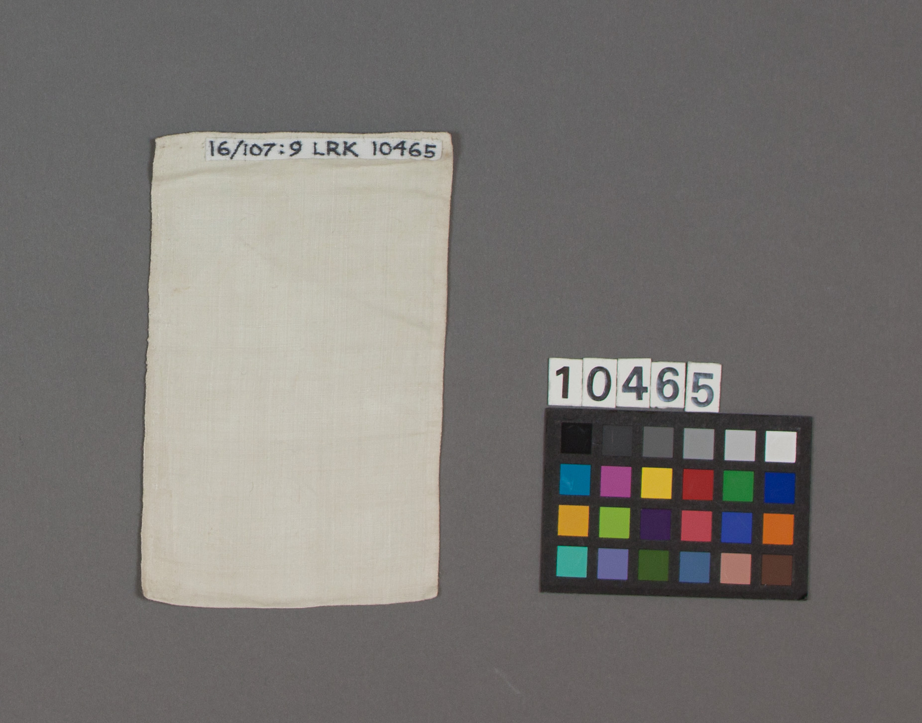 Plagg ingående i en korg med babykläder som använts av Sofia och Oskar (II):s barn. Rektangulär navellapp av dubbelt linnetyg med handsydda sömmar. L: 150 mm, b: 92 mm