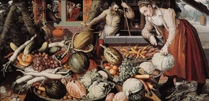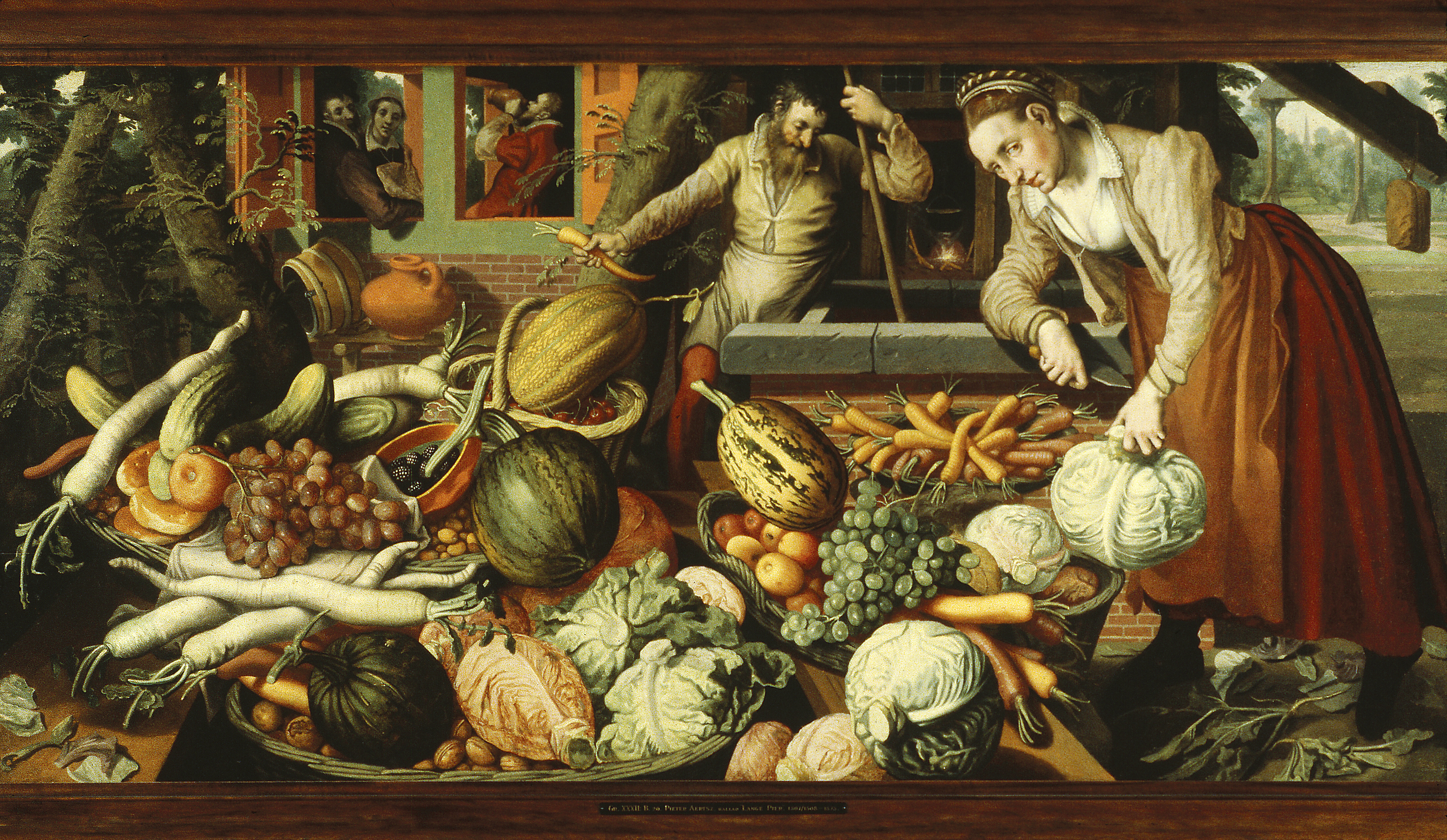 - Frukt- och grönsakshandel. I förgrunden framför två tätt intill hvarandra liggande hus en bänkställning af tre bruna bräder, främst inom denna en stor grön flätad korg, fylld med valnötter, ofvanpå dessa morötter och palsternackor, en gulstrimmig mörkgrön och en ljusare pumpa med stjälkar samt tre röda och två gröna kålhufvuden. Å brädan till vänster bitar af kålblad samt längre bort en grön flätad korg, fylld med hasselnötter, ofvanpå dem några bröd, ett gulrödt äpple med borttaget fruktskaft(?), dessutom gurkor och palsternackor samt på en hvit duk en stor klase blåa drufvor; bakom denna och delvis täckt af duken en liten röd skål med mullbär. Därbakom å den bakre brädan en gul flätad korg med högt handtag, till större delen fylld med körsbär, ofvanpå dessa en melon. Å högra brädan en grön flätad korg med sidohandtag, fylld med melonäpplen, ofvanpå dessa gula och röda morötter, en klase gröna drufvor samt en grönfläckig gul pumpa med stjälk; framför korgen ett grönt kålhufvud, nedanför till vänster två röda. Öfverst till höger en liknande korg med röda morötter. På marken nedanför en grön korg med gröna kålhufvuden, framför korgen grönsaksblad. Till höger därbakom en brunn med tegelmuradt brunnskar, upptill afslutadt med en utspringande grof kantlist i grått; härtill en brun vindinrättning med handstången i brunnen och vågarmen synlig längst till höger med hängande brun tyngd. Vid brunnskarets vänstra sida en äldre man, stående något lutad öfver brunnen, hufvudet i halfprofil åt höger, i högra handen en morot, den vänstra hållande om vindstången; med lockigt mörkt hår och ljusare helskägg, i skjorta med utviken spets-kantad krage samt öppen framtill, ljusgrå tröja med korta ärmar och hopfäst på midten, halflångt ljusgrått förkläde och röda benkläder. Vid brunnens framsida till höger en ung kvinna, vänd halft åt vänster, något framåtlutad, stödjande högra armen mot brunnskanten, i handen en trädgårdsknif, den vänstra hvilande på ett grönt kålhufvud; med bruna ögon, brunt hår, upplagdt kring hufvudet med vindor, hårdt lindade med hvita band, dessa fortsättande i två hvarf nedanför vindorna, i ljusgrå tröja med' långa ärmar och löst hopknuten smal halssnodd, svart lifstycke samt hvitt linne med utviken spetskantad krage, halflång röd kjortel, brunt förkläde samt till synes strumpor och tofflor i svart. Vänstra husets nedre del af rödt tegel, det högra af trä. Å det förra två fönster med gröna karmar och uppslagna röda luckor. I vänstra fönstret två figurer: till vänster en medelålders man med mörkt hår och helskägg, i svart barett, brungredelin rock och veckadt hvitt halskrås; till höger bakom mannen en medelålders kvinna med mörkt hår, i hvit hätta, svart tröja och utviken hvit halskrage, rundt halsen ett smalt hvitt band, nedhängande framtill, samt hvitt förkläde. I högra fönstret en man, förande ett rödbrunt lerkrus till munnen, med blondt hår och helskägg samt i röd rock och hvitt halskrås. I rummets bakre vägg två fönster, genom hvilka ses gröna träd och en strimma af himlen. Till vänster om vänstra huset mörka trädstammar med flikiga löf, ett grått staket och ljus himmel; vid husets högra hörn en lutande mörkgrå trädstam; vid husväggen en enkel gråbrun bänk, å denna till vänster med stöd af en brädklots en brungul bytta med grepe och tre ljusgråa band, till höger därom ett stort bukigt rödt lerkrus med henkel. Å högra husets framsida en dörr med brun karm och rödt öfverstycke, däröfver ett fönster med smårutor. Genom dörröppningen en eld synlig och öfver denna en svart gryta, hängande i en kätting. Till höger i bakgrunden en köksträdgård, bakom denna ett grått porttak, uppburet af två stolpar. Längre bort en trädplantering, vid horisonten ett grått kyrktak med tornspira. Ljuset från vänster. Ej signerad. Å trähuset å fönstrets nedre karmstycke årtalet: HOZ På trä. Baksida parketterad. Höjd: 0.835 m.; bredd: 1.695 m. Pieter Aertsz. (Aertsen), för sin ovanliga längds skull kallad »Lange Pier», f. 1507 eller 1508 i Amsterdam, begrafven 3 Juni 1573 därstädes; lärjunge af Allaert Claeszoon; målare, verksam i Antwerpen från ungefär 1535 till 1556, därefter i Amsterdam. Enligt Alfred von Wurzbach: »Niederländisches Künstler-Lexikon», Erster Band, Wien und Leipzig 1906, samt »Katalog der Gemälde, Miniaturen, Pastelle u. s. w. im Reichsmuseum zu Amsterdam», 1920. Se »Kunstgeschichtliche Monographien», IX, Johannes Sievers: »Pieter Aertsen. Ein Beitrag zur Geschichte der Niederländischen Kunst im XVI. Jahrhundert», Verlag von Karl W. Hiersemann, Leipzig 1908, sid. 101; äfvensom Olof Granberg: »Inventaire général des trésors d’art, peintures & sculptures, principalement de maîtres étrangers (non Scandinaves) en Suède», Tome II, Stockholm 1912, n° 335 (sid. 93). Ram (ny): Af päronträ, brunbetsad och polerad; på blindram af furu. Profil som figuren (orig. 8/i): Glas. Höjd: 1.055 bredd: 1.915 m. Gåfva till Wilhelmina von Hallwyl, f. Kempe, Julaftonen 1898 från hennes make, Walther von Hallwyl, f. 26 Januari 1839 i Bern, d. 27 Februari 1921 i Stockholm. Inköpt af den sistnämnde 4 Maj 1898 hos konsthandlaren H. Bukowski, Arsenalsgatan 2 D, Stockholm, se räkning samma dag. Betald 4 Maj 1898, se Rescontra (Walther von Hallwyl). Pris: Kr. 450, se räkning. Kända tidigare ägare: 1. Kejsar Rudolph II:s Konstkammare i Prag, af svenskarna tagen som krigsbyte 1648, se bref från f. d. bibliotekarien Olof Granberg 7 November 1920: I ett i f. d. K. K. Reichsfinanzarchiv i Wien förvarat inventarium (i kopia) från 1621 öfver den kejserliga Konstkammaren i Prag uppförd först af alla taflorna »N° 811. Erstlichen ein Obstmark vom Langen Peter. Originalstuck.» 2. Öfverste-kammarjunkaren friherre Knut Kurck, Ekensholm, Dun