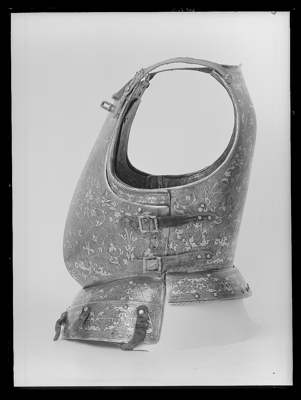 Driven stålplåt med på utsidan förgylld dekor mot mörk bakgrund. Insidan brunaktig med tydliga hammarslag. Sammanlagt fem delar. Rundade urtagningar för hals och armar. Omvikt, rundsmidd och repstavsfilad kant med kraftigt mittparti, h 10 mm, avsmalnande åt sidorna. I armhålorna skena, b 44 mm, fästad med två nitar och formad efter urtagningen som ett rundat L. Skenan upptill delvis rörlig genom ett förstorat nithål. I var sida två kraftiga söljor av stål, 41 x 29 mm, med spetsig platta och rektangulär och slät ram med ändarna vinklade uppåt 45 grader. Längsgående mittås nertill driven till polichinell. Harneskets nedre kant driven till utåt och snett nedåt riktad krage, b ca 17 mm. Vid kragen nitad en välvd bukskena nnr 23385. Vid halsen en tapp, 19 x 15 mm, med från sidan rektangulärt hål. Under tappen ett hål, diam 3 mm. På höger bröst tre hål med skruvar och nit för landshaken. På baksidan förstärkning av en åtttsidig och över den en rektangulär plåt. Upptill vid axlarna två hål, diam 4 mm, och utstående nit med kullrig blank skalle. Dekor: Hela ytan blånerad. Mot fint skrafferad yta ett slingrande rankmönster av påslaget guldbleck och prickpunsade kantlinjer. Dessutom ett oregelbundet mönster av 5 mm breda band längs kanterna och genom rankorna. Banden består av i mitten försänkta punkter fyllda med guld, på var sida två tunna linjer av påslaget guld med en yttre linje av punsade prickar. Kragen nertill förgylld