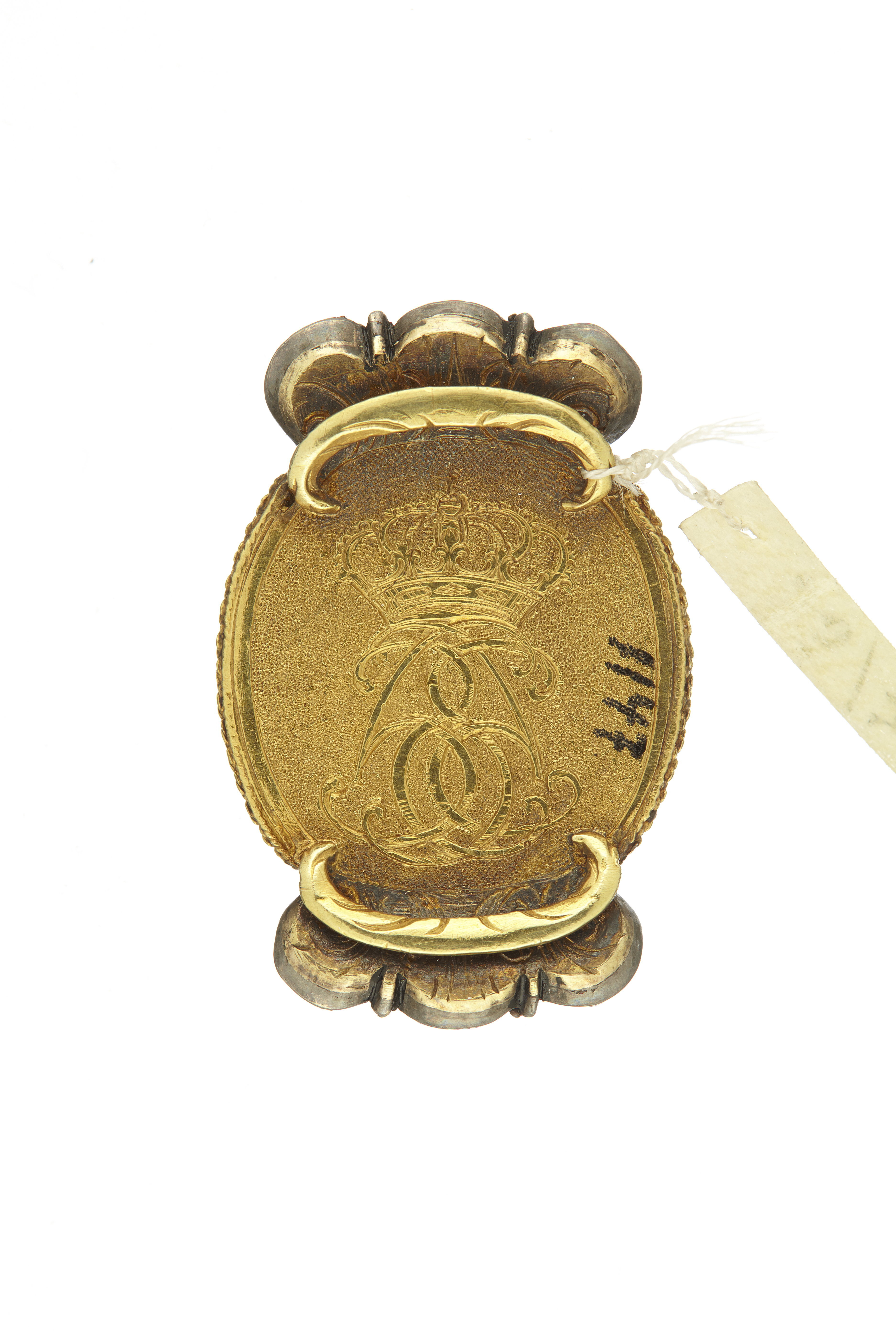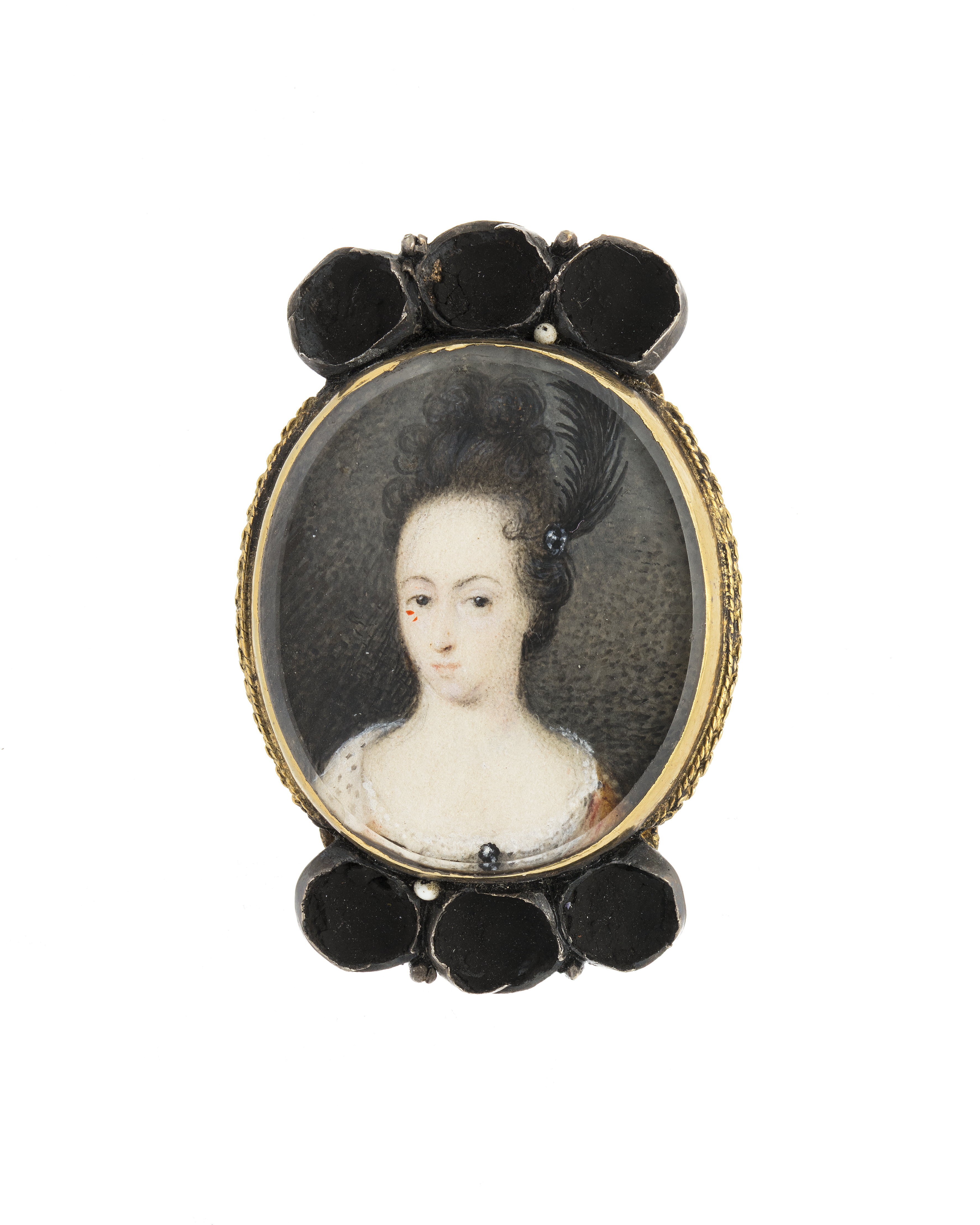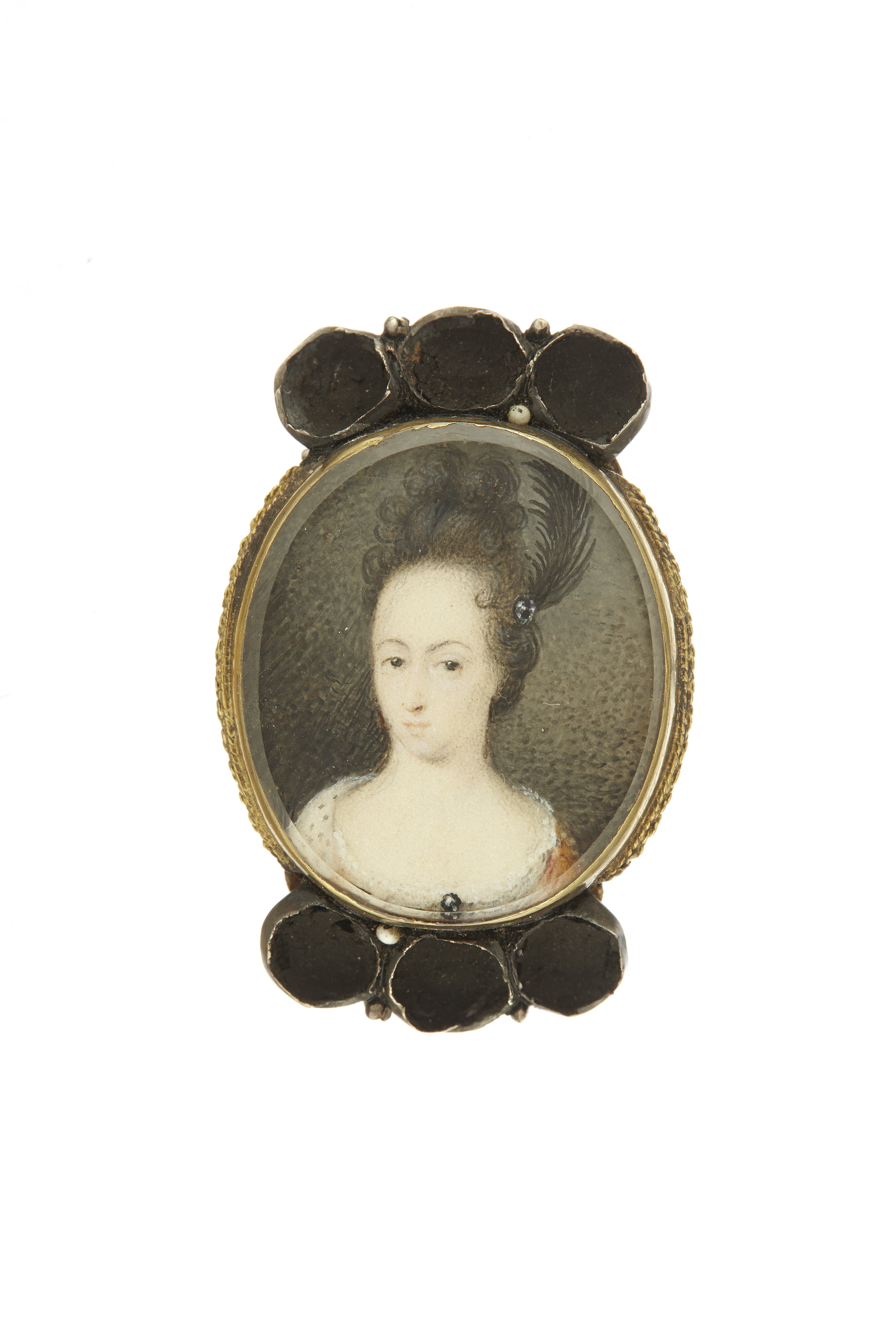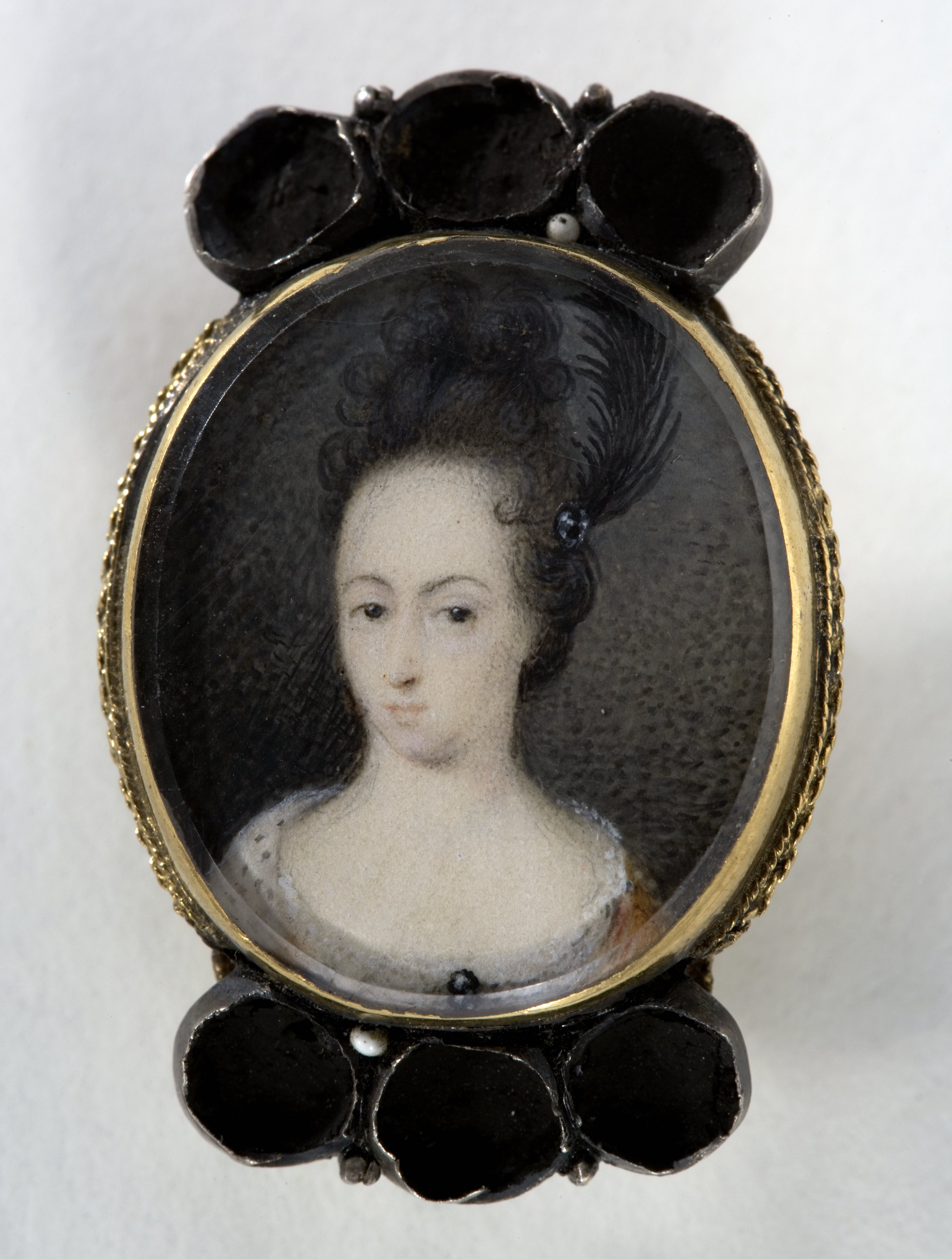 Miniatyrporträtt av prinsessan Hedvig Sofia av Sverige (1681-1708) g m hertig Fredrik IV av Holstein-Gottorp. (Enligt inv. 1867 stod från början drottning Hedvig Eleonora, detta överstruket och ersatt med prinsessan Hedvig Sofia). Oval gouache efter David von Kraft (1655-1724, SPA Index III, Hedvig Sofia typ 13, s. 332). Bröstbild, fas v, gulbrun klänning med hermelinsbräm, hög frisyr med svart plym, grå fond. Monterad under glas med fasad kant i bracelette av guld, slät fattning, nertill repstavsbård. På baksidan graverat namnchiffer under kunglig krona, spegelmonogram HS, punsad bakgrund, två rundade bandbyglar av guld. Upptill och nertill fattningar för vardera tre stenar av delvis förgyllt silver, i fattningarna spår av svart vax.