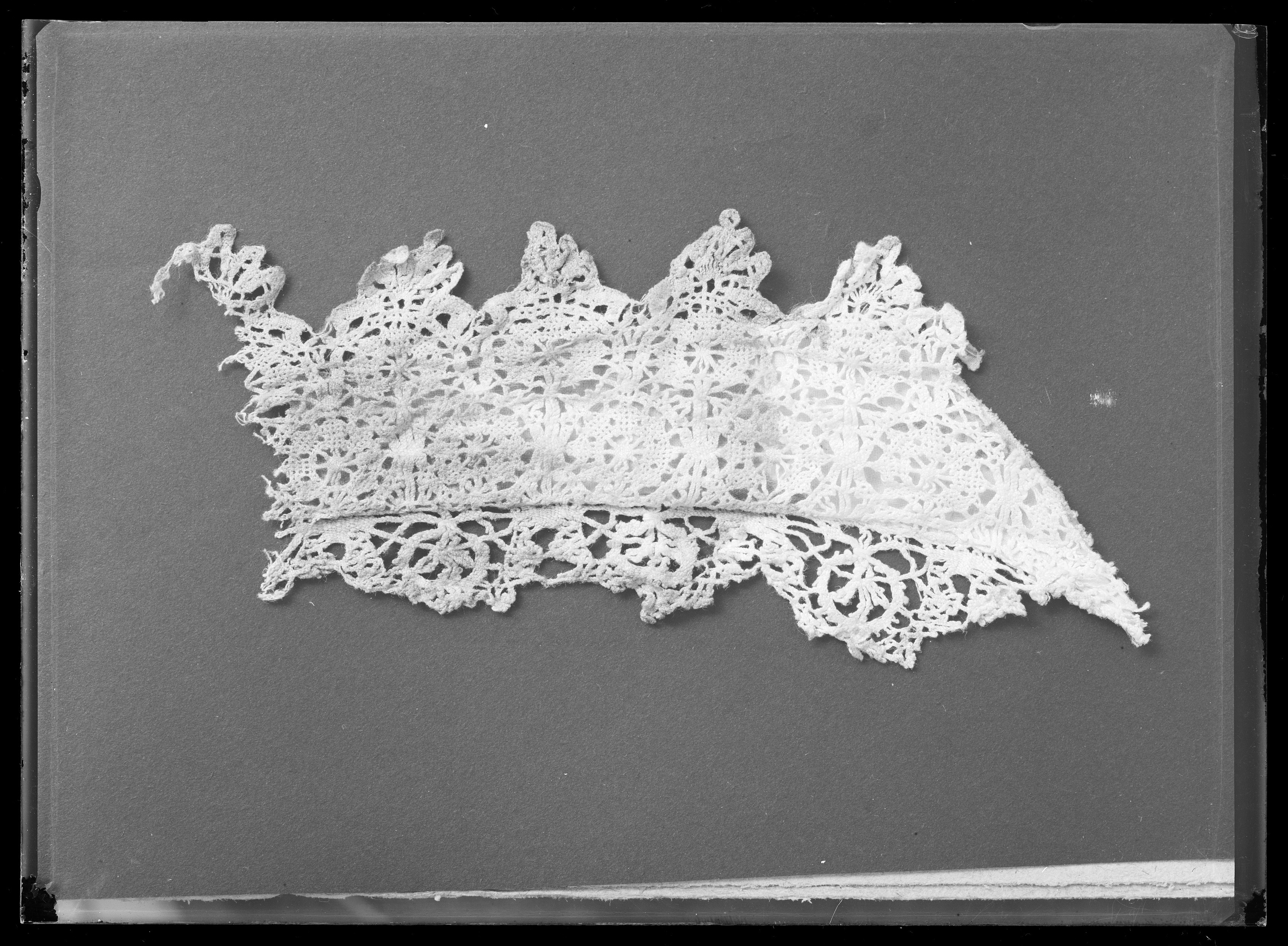 Dubbelt tygstycke ca 12 cm i längd, med vidsittande spets, 6 à 7 cm bred, blodindränkt.