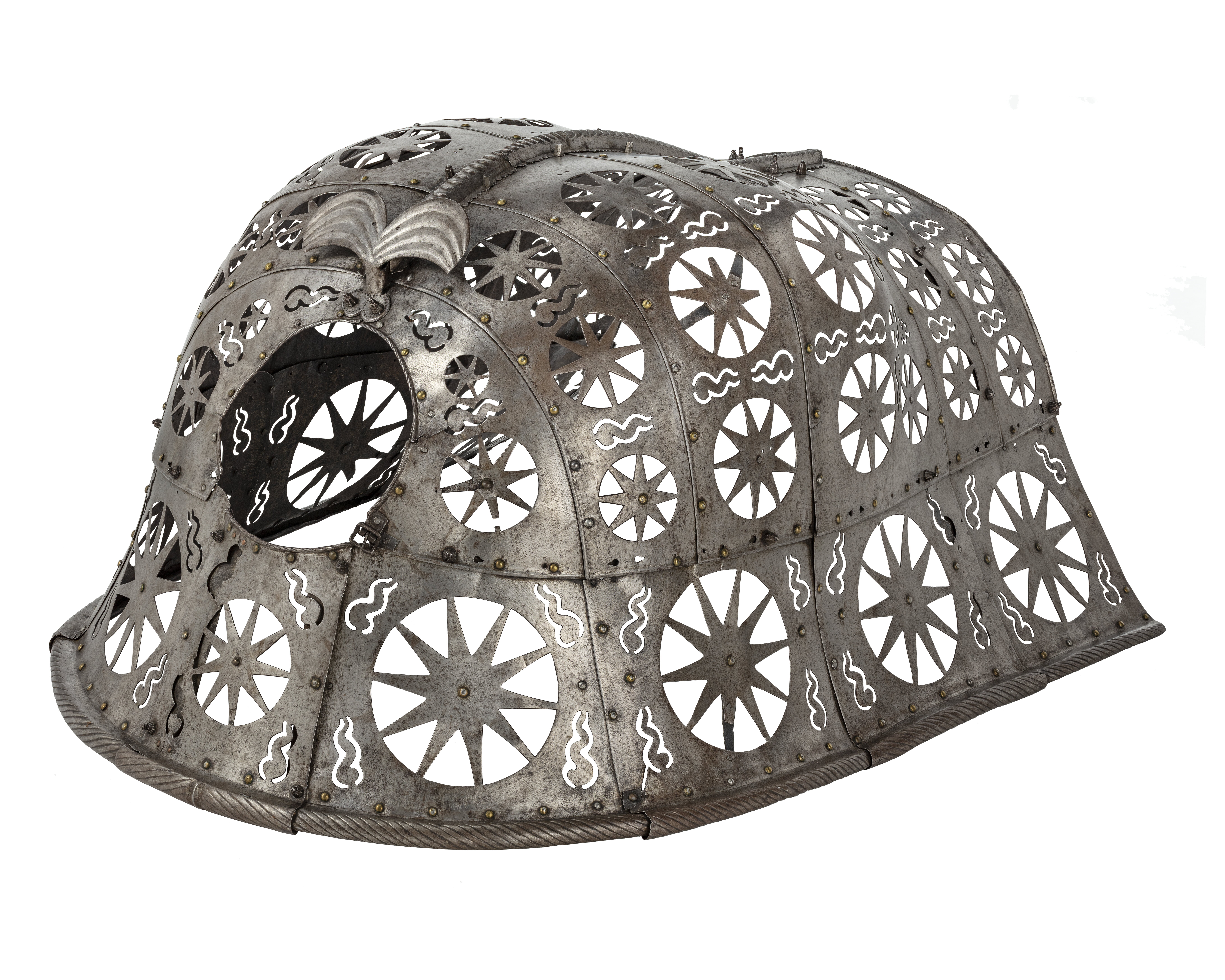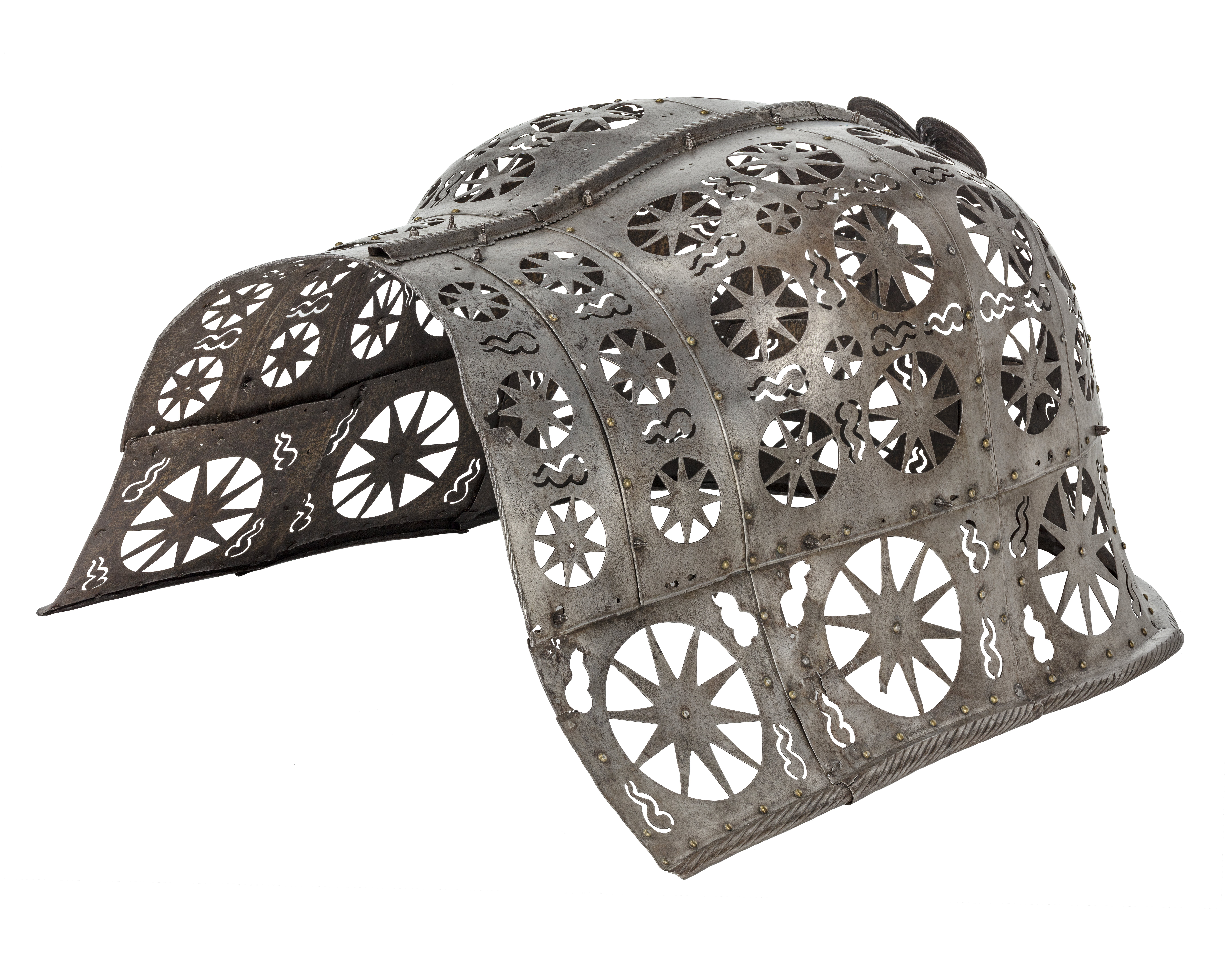 23450- huvudbetäckning, genombruten m stjärnmönster, manpansar i 11 delarbogpansar, ländpansar enl. Steneberg Erik XIV:s (sid. 312)