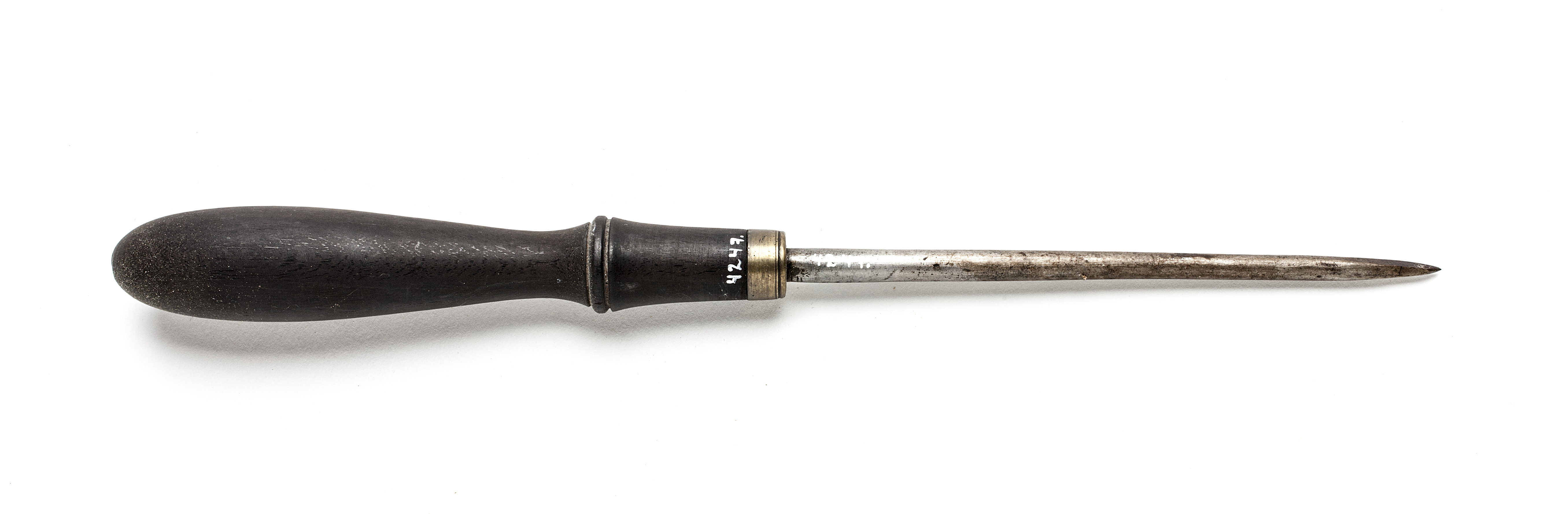 Runt stål, i änden med trapetsformig genomskärning. Svarvat skaft av ebenholts med en vulst. Mässingsring.