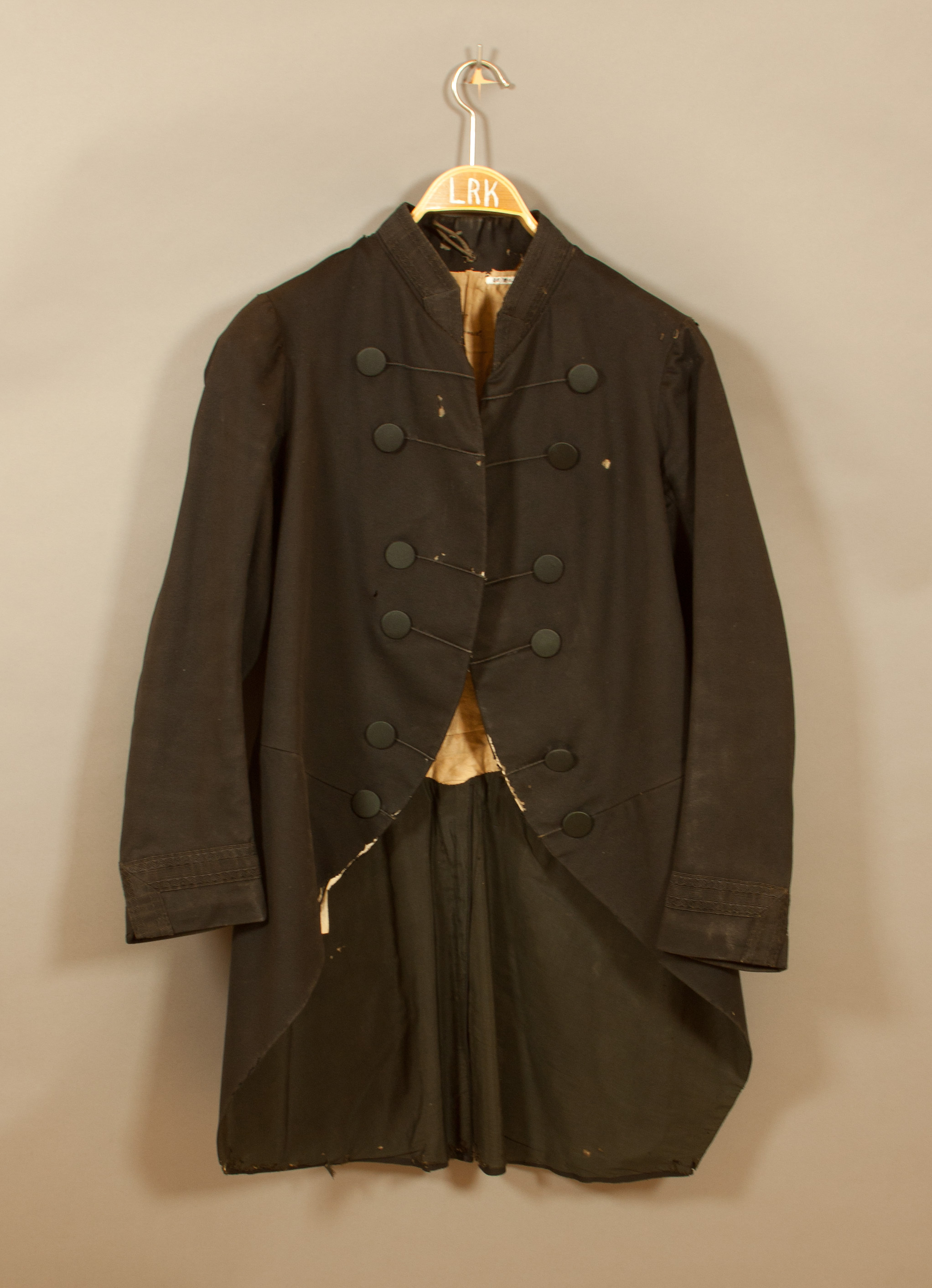 Frack av svart kläde tillskuren med midjesöm, mittsöm i ryggen, falsk dubbelknäppning, 2 x 6 platta knappar grupperade fyra och fyra, d: 27,6 mm, klädda med fint svart ylletyg ifrån knapparna till kanten svarta snoddar. Ihopfästning kant i kant med två hyskor och hakar. Ståndkrage med svart yllegalon, b: 34 mm. Nertill på ärmarna sprund, l: 70 mm, knapphål (knapp saknas) svart galon 36 mm från nederkanten samt efter sprundets framkant. Skört med sprund från midjan, rakt avskurna framkanter från midjan till 330 mm från sprundet, veck på hela längden 90 och 95 mm från sprundet. Vid midjan mittbak tre varandra delvis täckande kvadrater sydda av den svarta galonen, mitt på de två yttre en knapp. På skörten dessutom ornament av påsydda galoner, l: 275 mm, b: 95 mm, med i mitten tre knappar. Foder av gulvit glättad bomull i ryggen, vid kragen skrivet med bläck: "Aspling" och därnedanför: "Hammarlund". På skörten svart satängfoder. På kragens insida ögla.