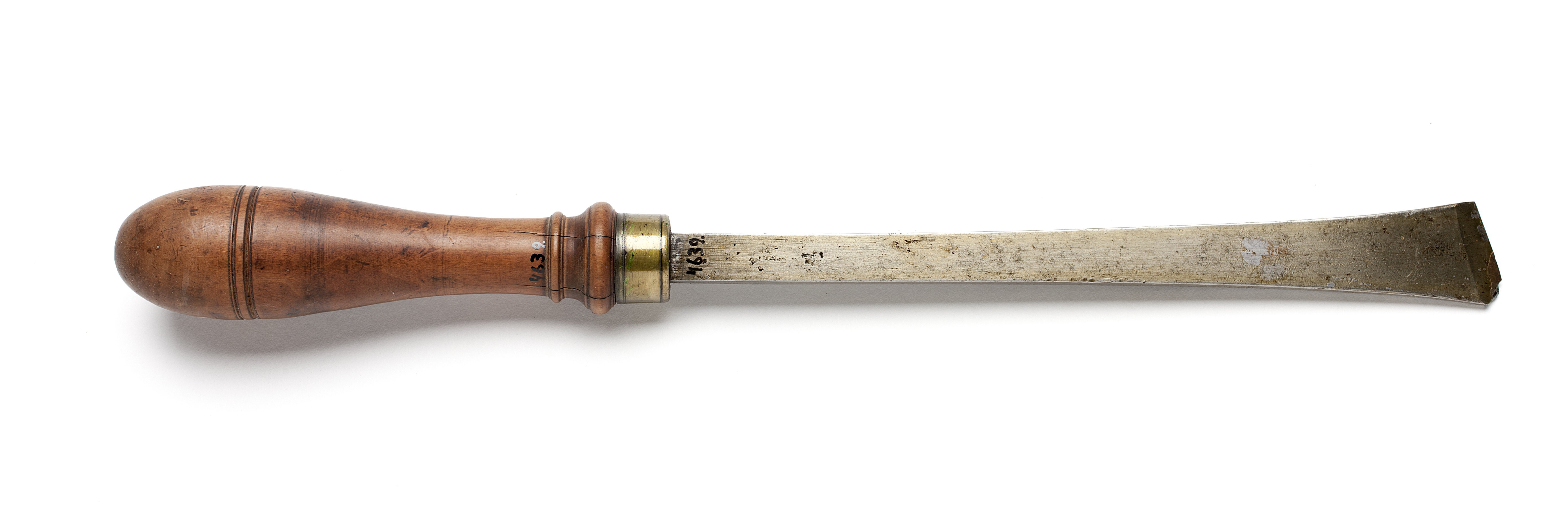 Klinga med rektangulär genomskärning. Sned egg. Svarvat skaft av päronträ med två vulster nedtill ("skoklostertyp"). Mässingsring. Stämpel på skaftets ände vid fästet: Två otydliga siffror.