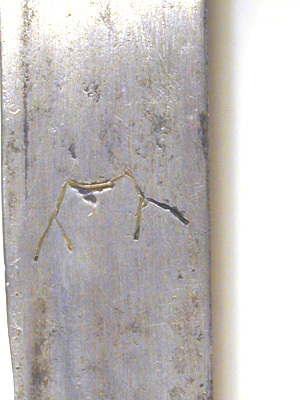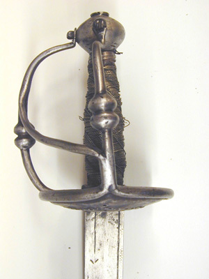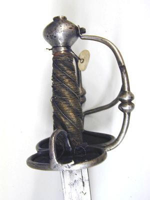 Fäste av stål. Knapp slät, av tryckt päronform. Handbygel och sidohandbygel med runt tvärsnitt, släta, något nedanför mitten två intill varandra liggan runda knoppar; mellan hand- och sidohandbygeln en något snett nedåtriktad spång av samma utförande som byglarna, dock utan knoppar. Parerplåtar (ej ursprungliga) genombrutna med ojämnt runda hål och inom stavformiga lister; den yttre: parerplåten större och fäste för sidohandbygeln; den inre oval, mellan dess yttre-kant och krysset en bågformig tumbygel. Bakre parerstång avbruten (förkommen). Kavellindning av tvinnad mässingstråd på spiralräfflad stomme, lär räfflan tvinnad mässingstråd. Klinga böjd, eneggad. Baspartiet slätt, c.110 mm från basen två tämligen kraftiga hålkälar följande klingan fram till ca 80 mm från spetsen. På insidan ca 90 mm frän basen ett i mässing inslaget märke, möjligen föreställande ett ulvmärke (Passau, här ej som tillverkningsort, endast som föregiven kvalitetsbeteckning).