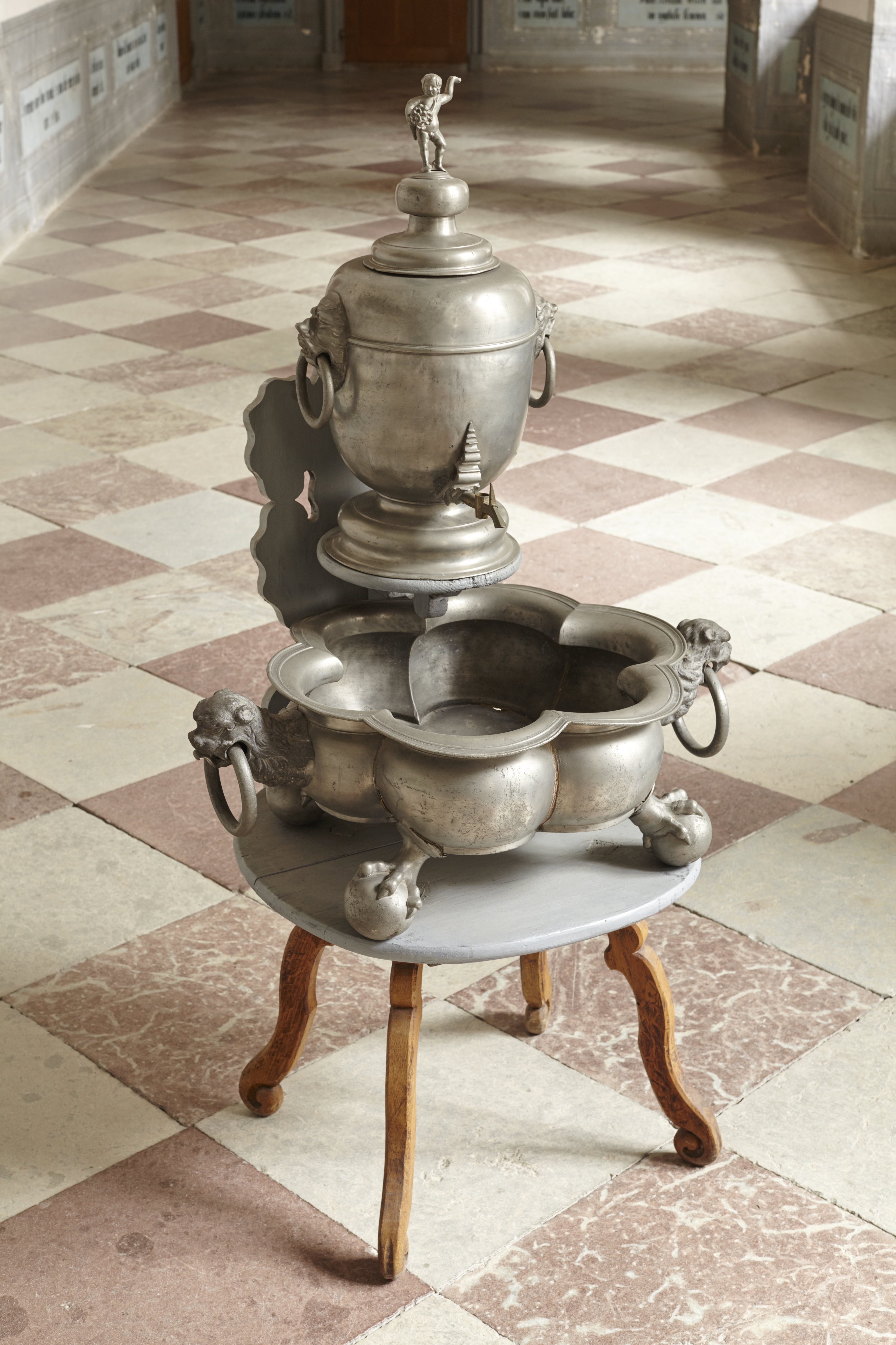 Troligen att skölja glas i. Urneformad reservoir med maskaroner o ringar. Lock med bajonettlås och putti med blomsterhorn. Tappkran av mässing. Bassängen sexpassformad på fyra klofötter med kulor. Handtag i form av långt utskjutande lejonhuvuden med ringar. Stämplar: Stadsstämpel (i spansk sköld med bård avslitet örn- eller griphuvud krönt med krona = Stettin), 2 mästarstämplar (i spansk sköld med bård stående figur med avkvistad trädstam i ena handen, figuren flankeras av bokstäverna CS. Uppmonterad på fotställning av gråmålad furu med fyra ben av ek samt skiva och rygg av gråmålad furu. 1600-tal. Märkt på två ställen med "3", märkt på ett ställe med N 1 (N:et är bakvänt).