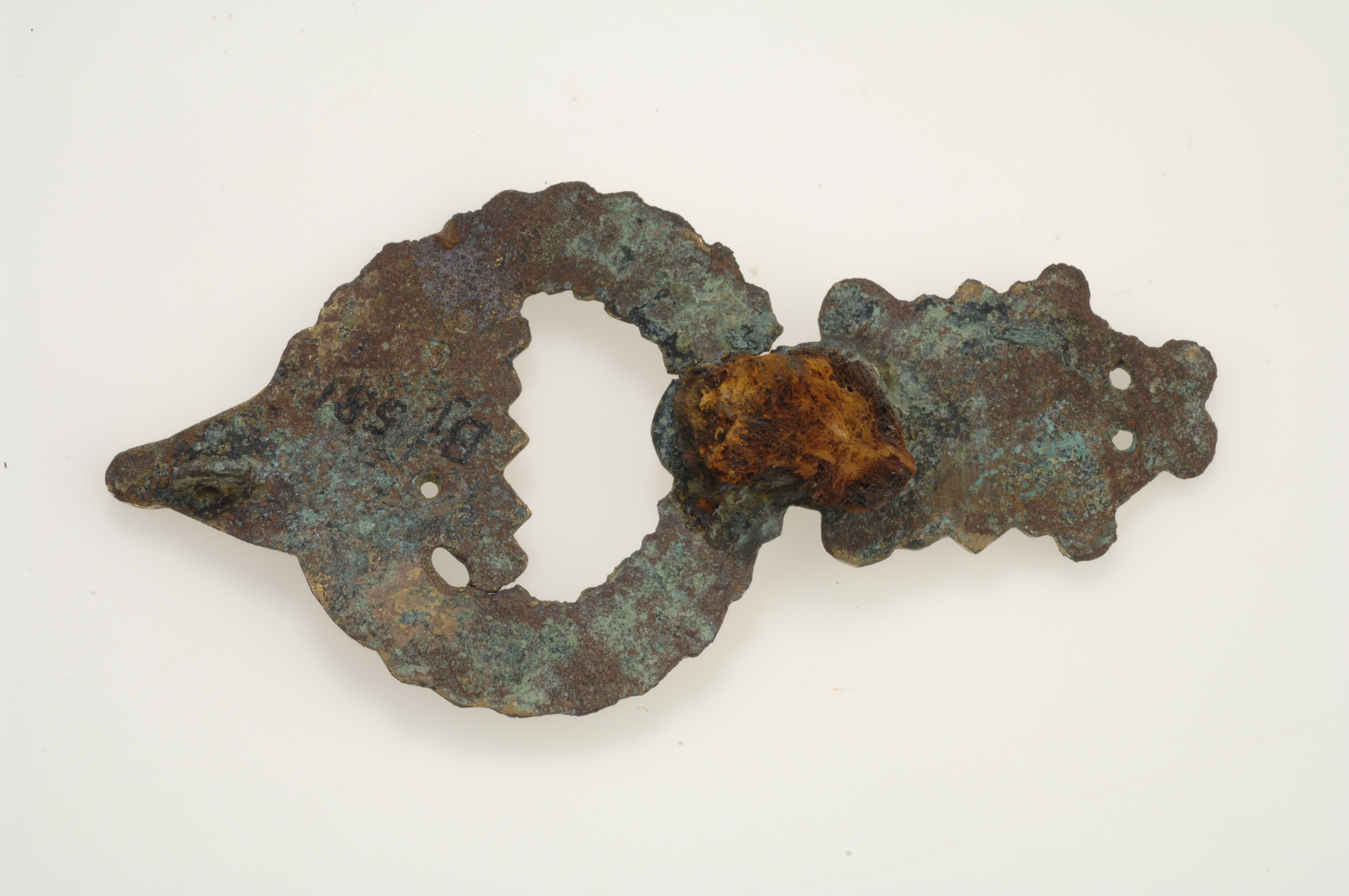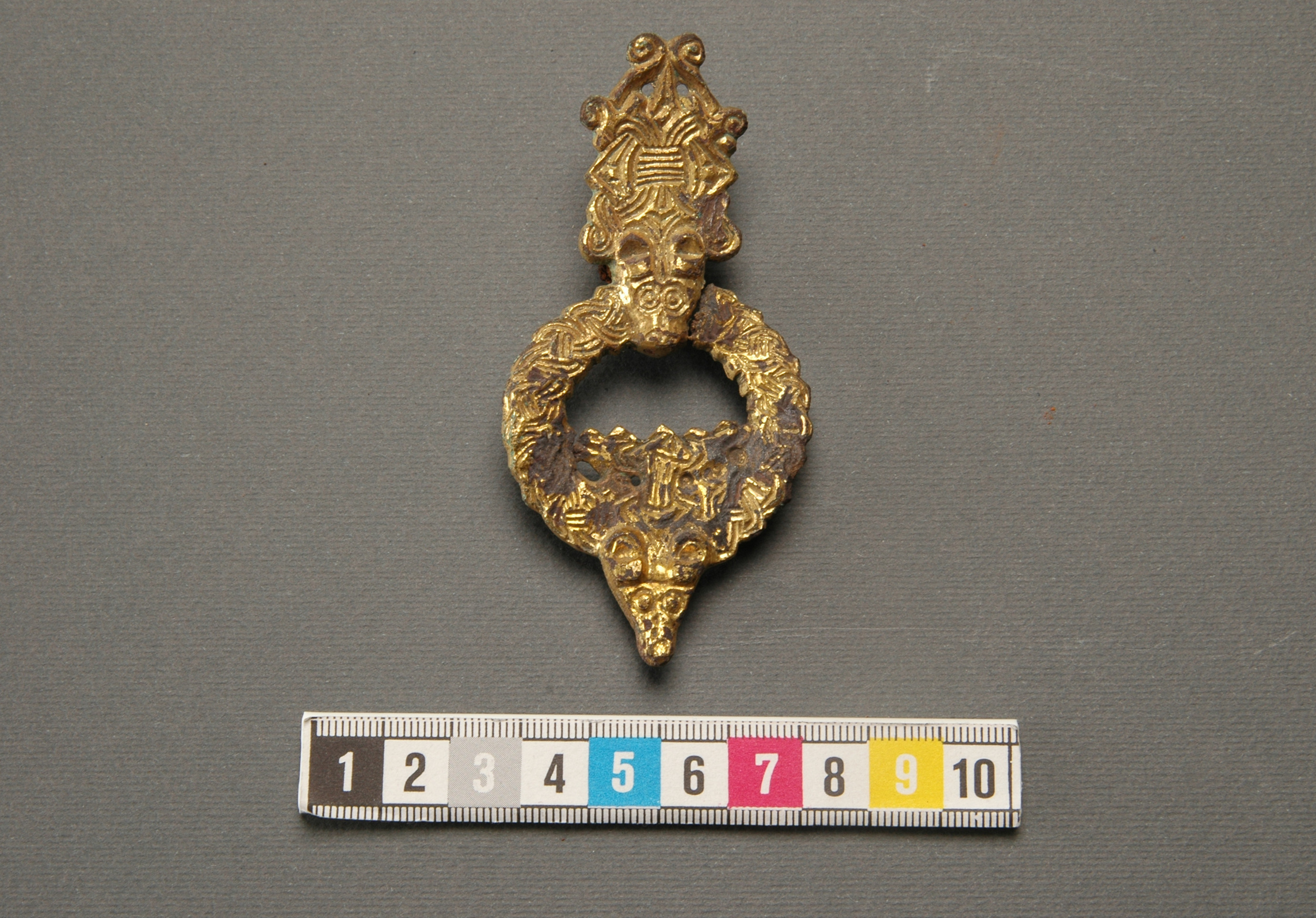 Ringspänne i borrestil av förgyllt brons. Nålen av överfångsgjutet järn saknas.