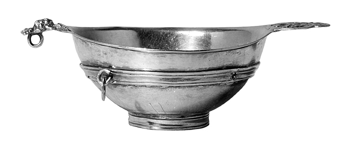Delvis förgylld. Oval, runt livet räfflad bård med ursprungligen fyra öglor med ringar