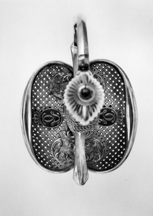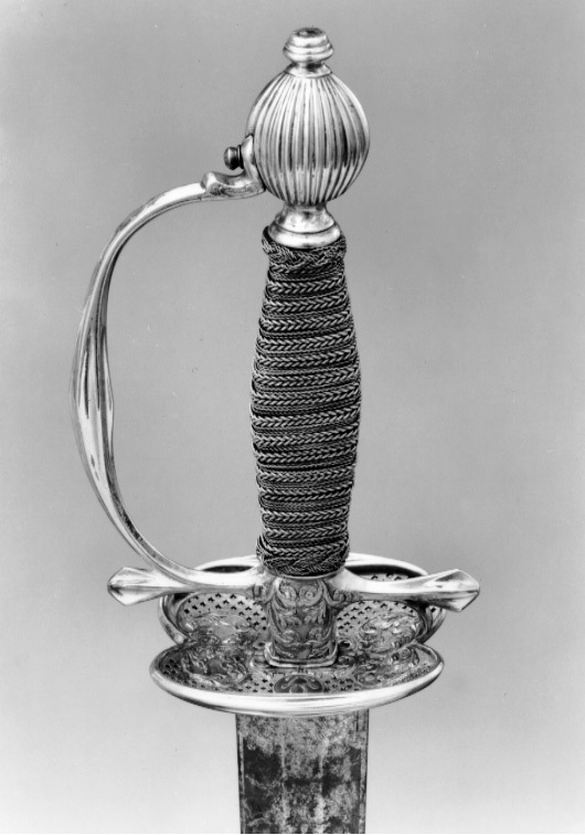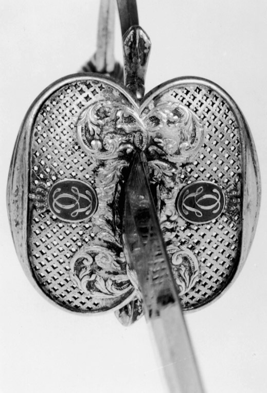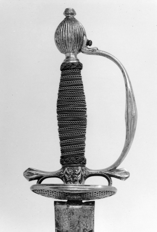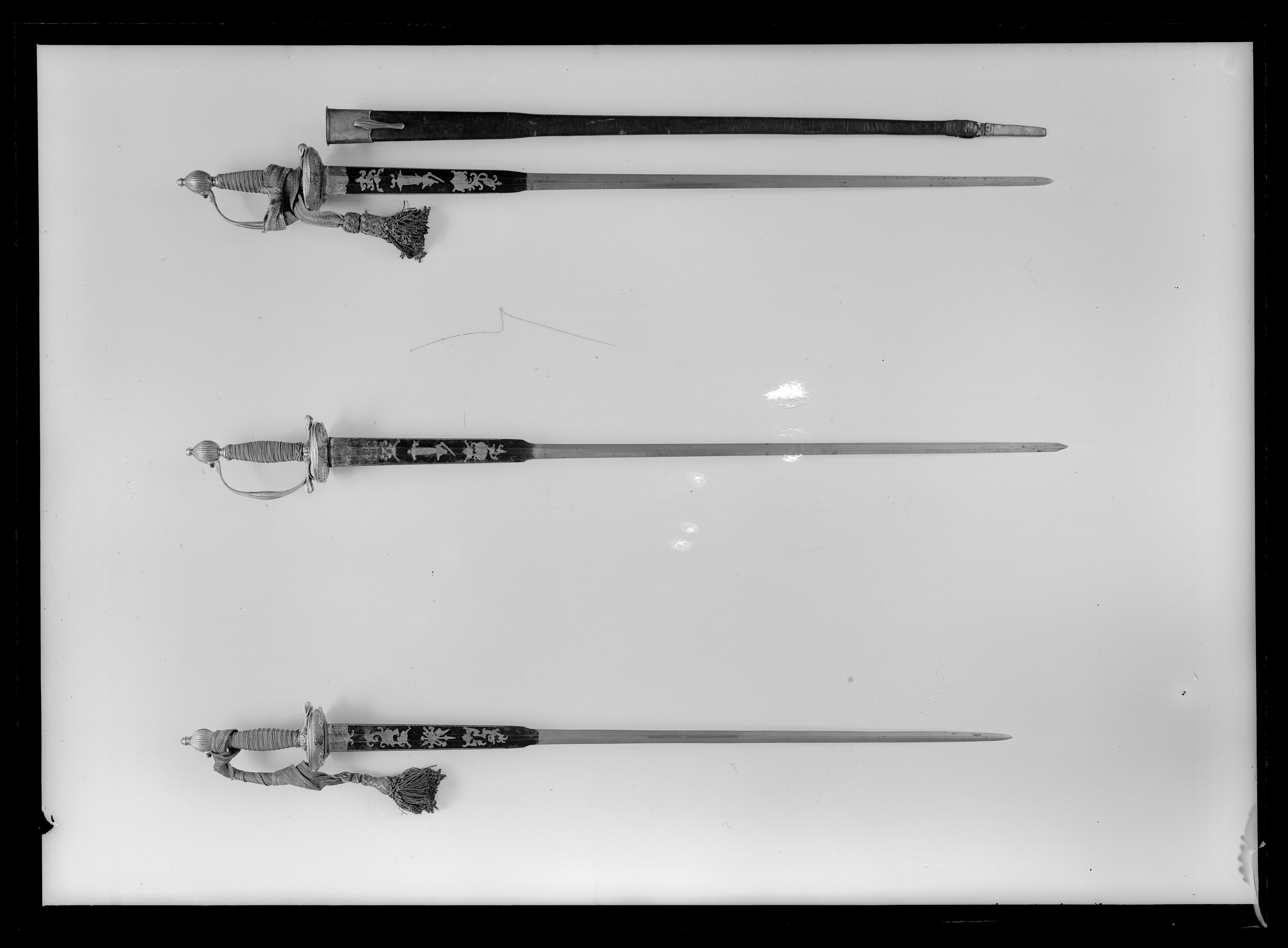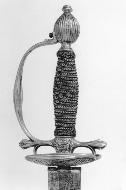 Fäste av förgyllt silver av efterkarolinsk typ. Fastlödda på parerplåternas ut- och insida på båda sidor om krysset en oval, blåemaljerad, krönt silverplatta med spegelmonogram G (Gustav III:s namnchiffer). På främre parerstångens insdia svensk kontrollstämpling: tre kronor, årtalsstämpel G2 (1789) och en otydlig stämpel. Klinga rak, tvåeggad med breddad starka del, s k colichemardeklinga med sexsidig slipning. Starka delen med etsad och förgylld ornering mot blånerad botten. Vid basen på båda sidor ett rektangulärt, förgyllt fält med graverat rutmönster. Därovanför på utsidan två rankornament, mellan dem stående kvinnofigur i fotsid därkt med höjt svärd i högra handen. På insidan två rankornament, mellan dem en trofégrupp med uppåtriktat kanonrör i mitten, belagd med en trumma och korsande standar och trumpet.