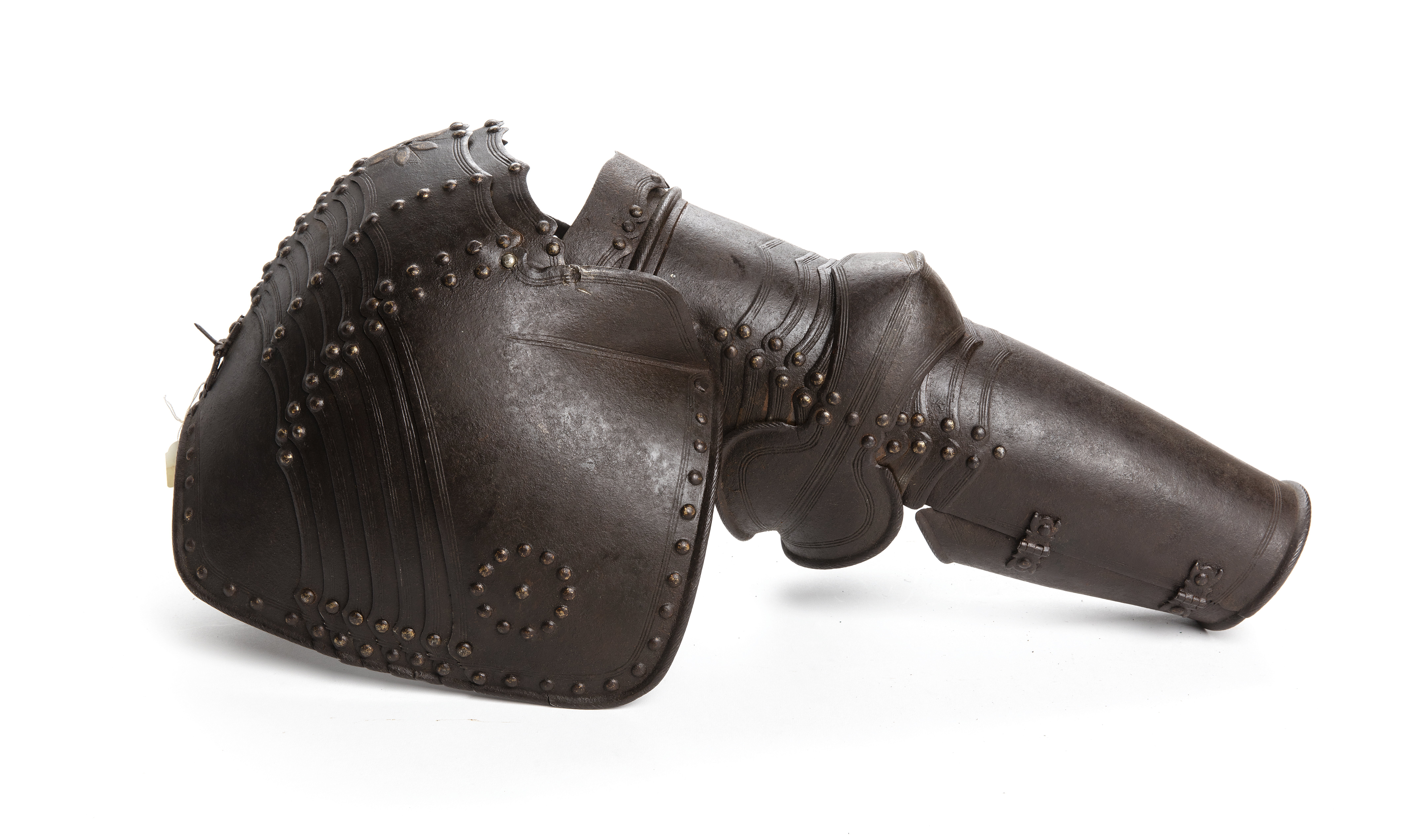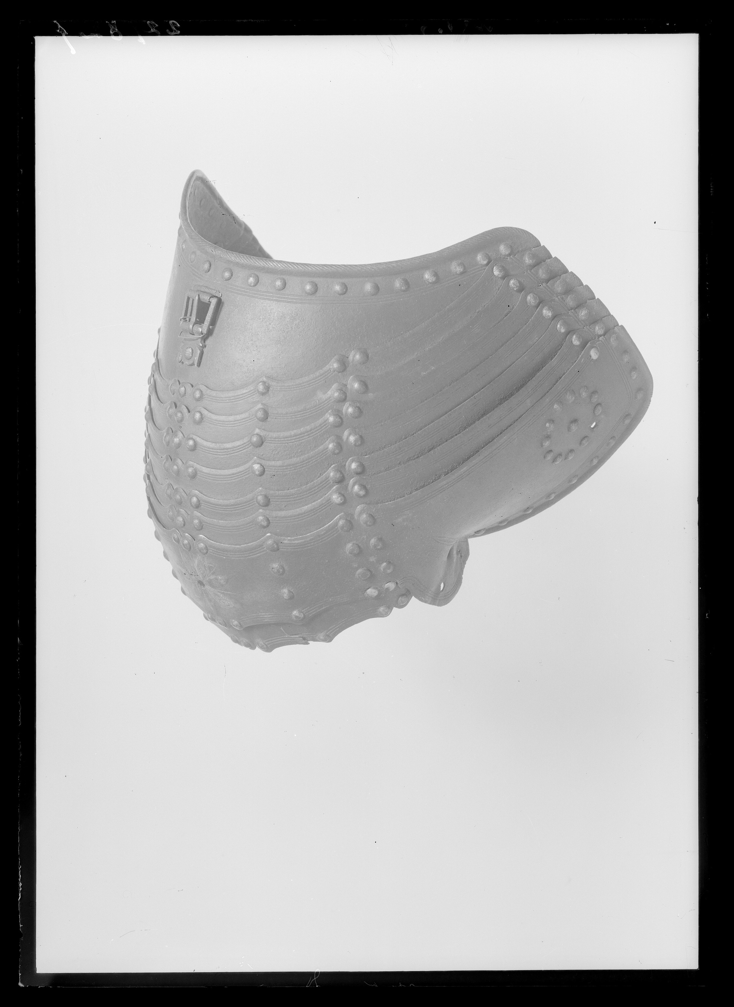 Axelstycke av svärtat stål bestående av 8 delar samt en del som tillhör armröret. Nedersta delen samt de sex ovanför nitade lamellerna med vågformig och spetsig profilerad överkant som markeras av dekorativa förgyllda nitar samt tre längsgående mejslade linjer. Den nedersta delen med motsvarande dekor i nederkant där armröret angörs. Mitt på en driven sjubladig förgylld blomma med mejslade strålar. På främre respektive bakre delen finns en cirkel bestående av tolv nitar varav en i varje cirkel har hållit en läderrem på insidan som fästs i de övriga lamellerna. Den främre cirkeln saknar en nit. Vid armurtaget nitar på ömse sidor med spår läderremmar. Längs axeln har en läderrem varit fastnitad för att förhindra att axelstycket faller samman. Ytterkanterna inåt omvikta och rundsmidda med mejslad repdekor. innanför denna en tät rad med nitar och därefter tre mejslade, parallella linjer. Översta delen med fyrkantigt urtag för rem som fästs i sölja med spår av förgyllning.