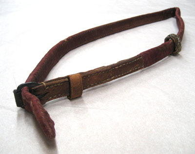 Rem av läder med ovansidan till stor del klädd i karmosinröd sammet. Närmast spännet ett läderparti, längd: 146 mm. Längsgående sömmar i kanterna, av beigefärgat snöre. I ena änden ett kvadradiskt spänne av järn, med något tillplattade sidor, en nål och löphylsa. Andra änden har en spetsformad avslutning. 14 synbara hål längs remmens mitt mot den spetsiga änden. Nedanför spännet en fast, tvärgående rem av läder för fäste av den spetsiga delen, fäst 38 mm från spännet, bredd: 12 mm. Rörlig, tvärgående och flätad rem av läder och beigefärgat och grått, tvinnat silkegarn, bredd: 17 mm. Hela remmen ihopspänd i andra hålet.