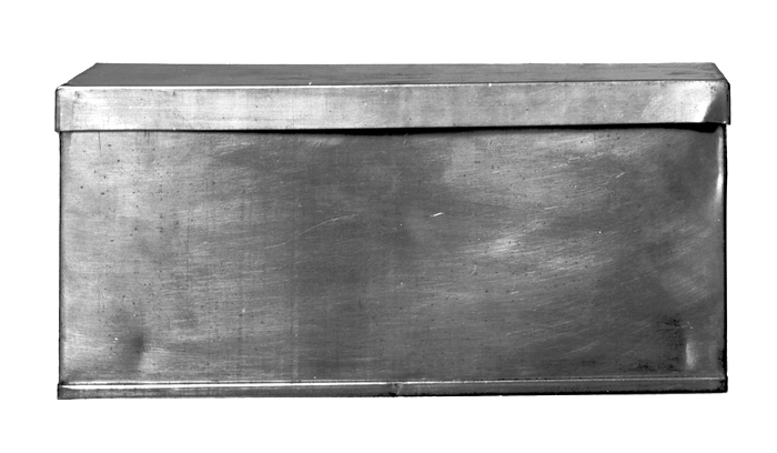 LÅDA. Av bleckplåt. Rektangulär, med trycklock. På ena kortsidan en vertikalt gående fals; övre kanten med en smal stavformig invikning; botten med en på utsidorna uppvikt smal fals. Lock plant, med utanpågående nedvikt kant. Höjd: 11 cm.; längd: 23,4 cm.; bredd. 11 cm.
