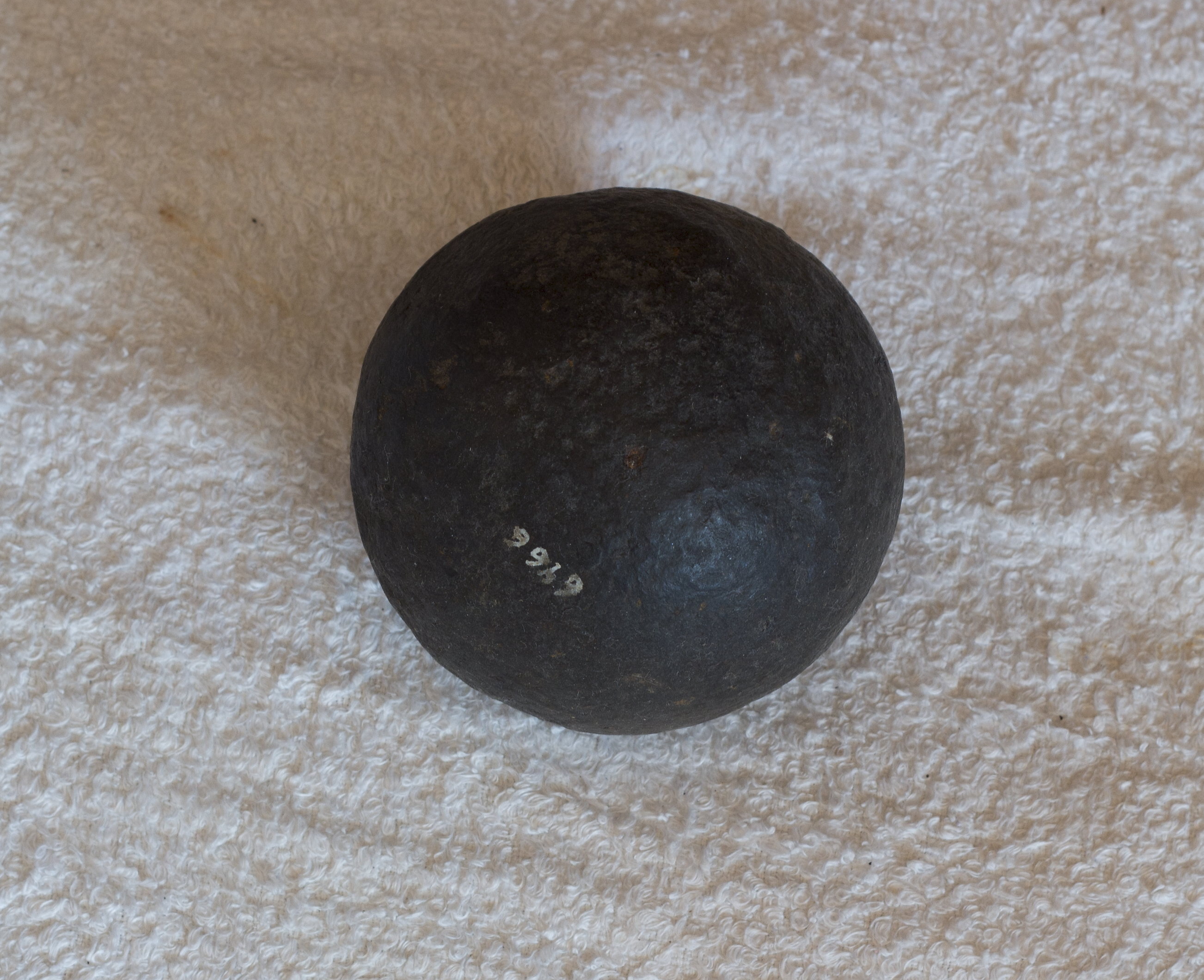 Rund kanonkula av järn, 75 mm i diameter.
