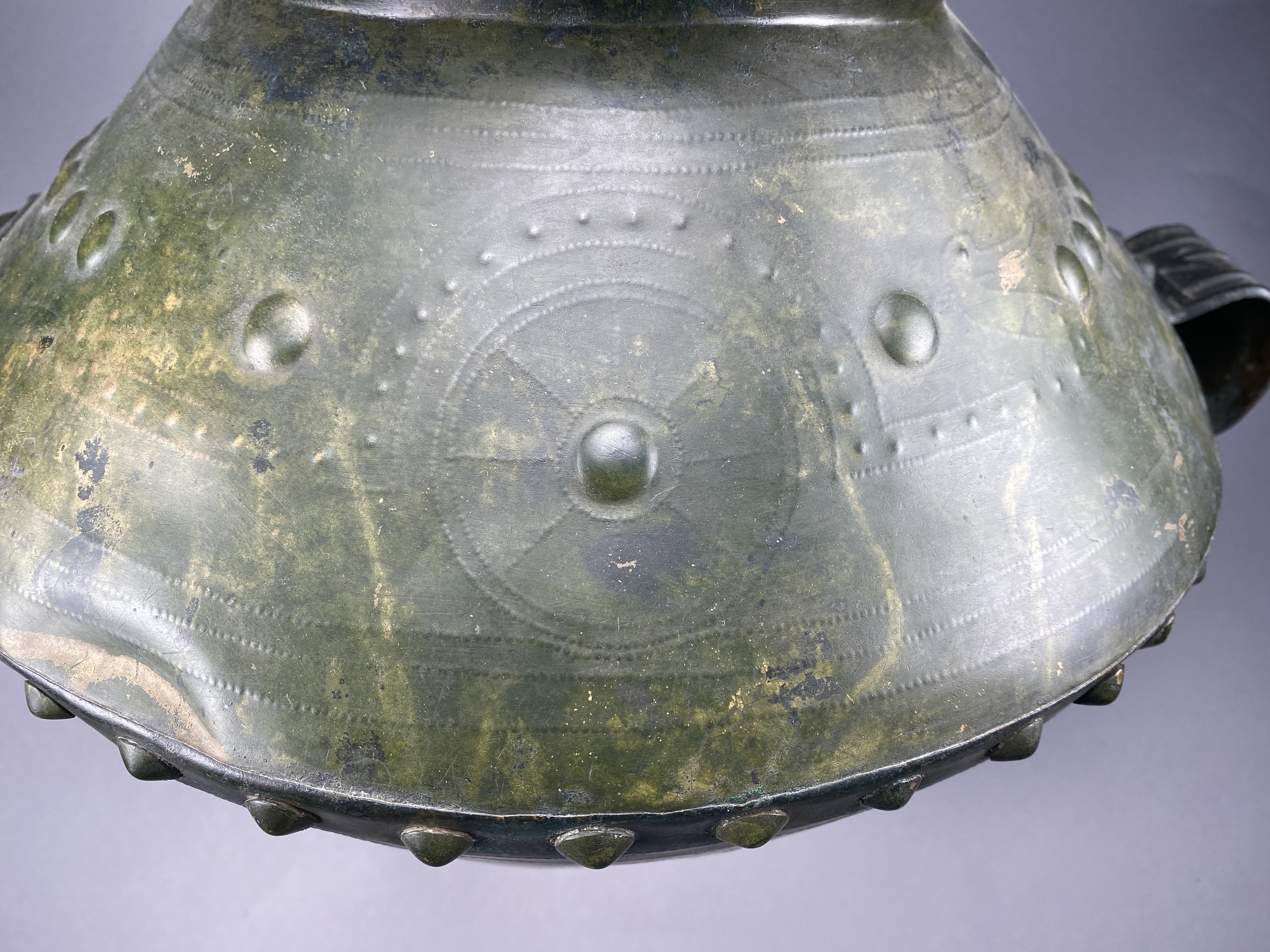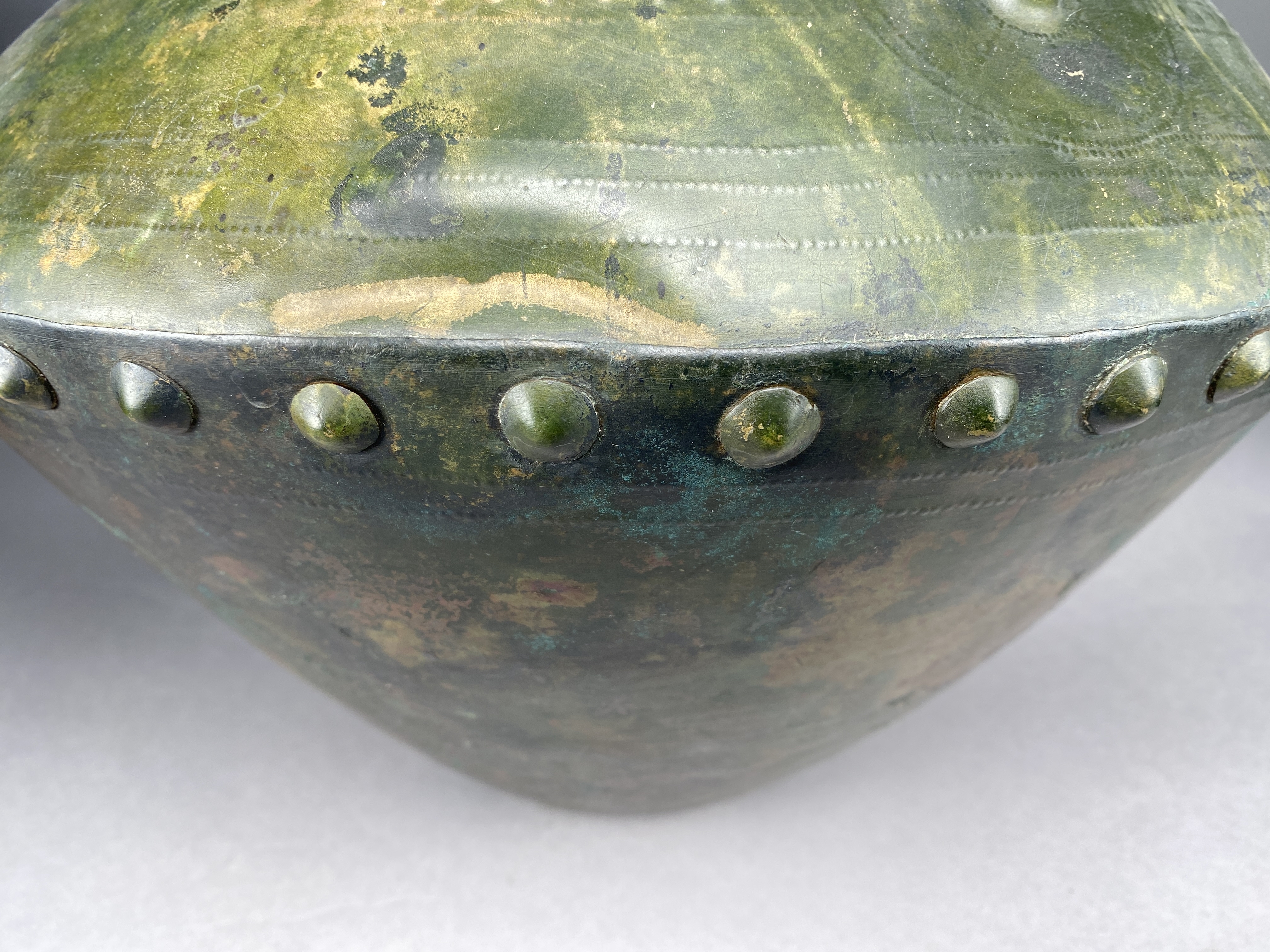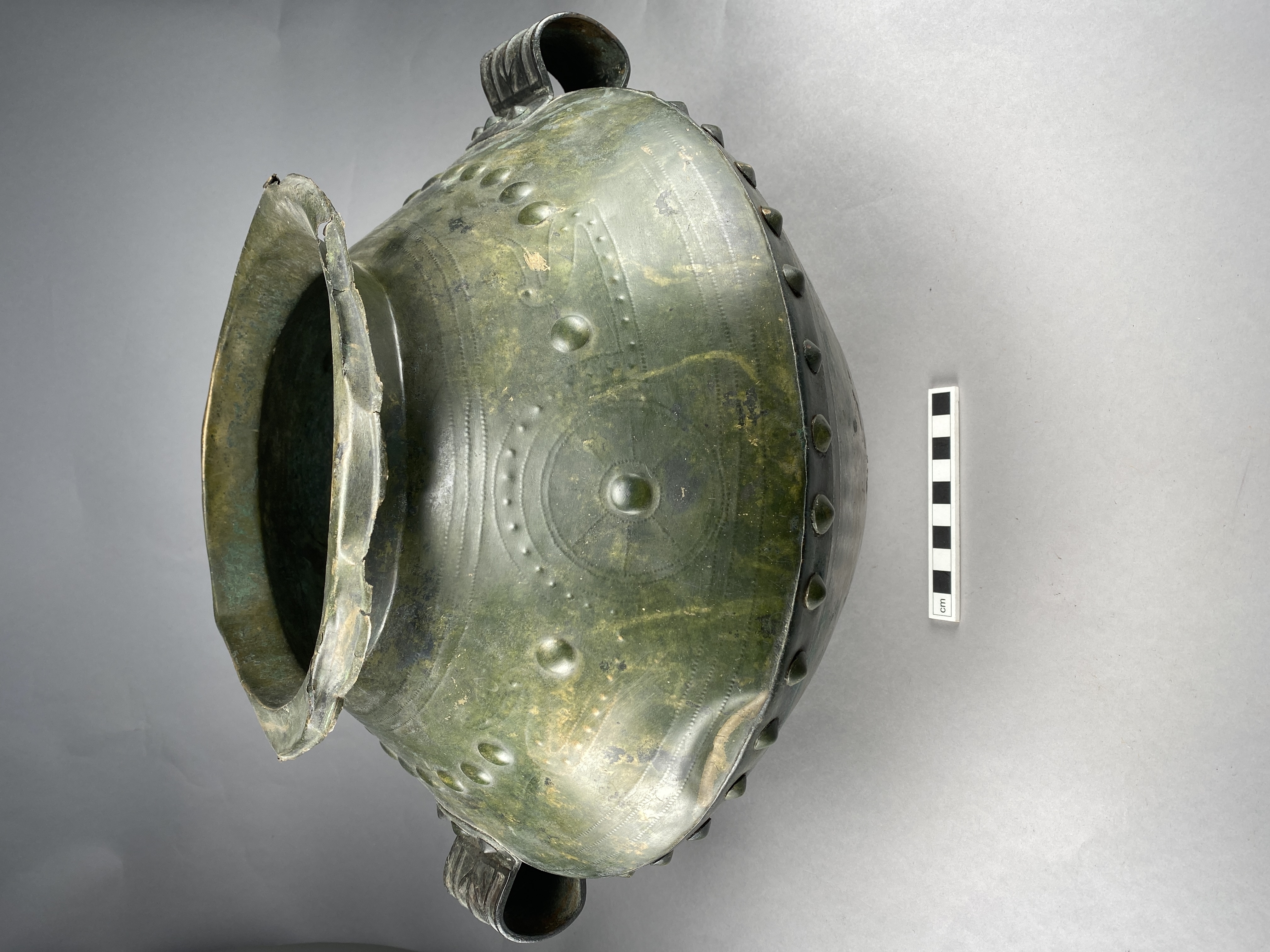 Kärl av bikonisk form gjort av hopnitade bronsplåtar. Överdelen har en driven ornering av större och mindre bucklor bildande linjer, solhjul och skepp med häst- eller fågelhuvuden i stävarna. Motivet föreställer den så kallade fågelsolbåten. Kärlet är försett med två pånitade öron. Den omvikta mynningskanten är något skadad. Tillverkad antagligen i Centraleuropa. Jfr den mycket snarlika amforan från Mariesminde Mose på Fyn, Danmark.