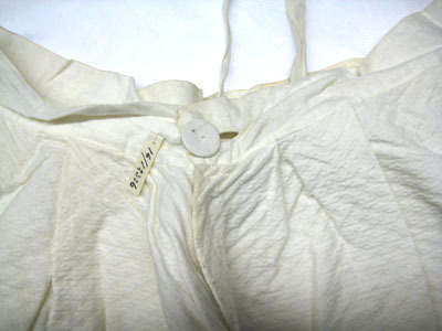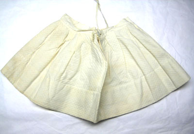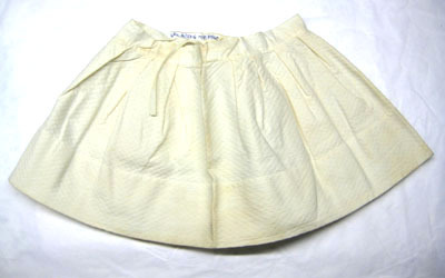 Vit kjol sydd i bomull där tyget är vävt i kypert med rombmönster (vit piké) vilket ger tyget en struktur. Linningen är av tunt bomullstyg och är 30 mm bred.Runt kjolen är veck (40 mm breda) fördelade som ger vidd till kjolen. Kjolen knäpps med en knapp som är 15 mm bred och knapphålet är 12 mm bred. Invändigt på varje sida är ett band fastsytt, 150 mm långt och 10 mm brett. Längst ner på kjolen är sömmen 70.