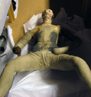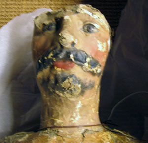 derpå sittande en karlfigur med förgyldt bröst och ryggharnesk. 2 armstycken af D:o D:o 1 Handske. 1 Höftstycke af D:o D:ot på kanterna, 2 lårstycken af D:o D:o 2 benstycken af D:o D:o med fötter och sporrar, 1 ringkrage af D: D:o 1 Sluten Hjelmaf messing, fodrad med karduan.