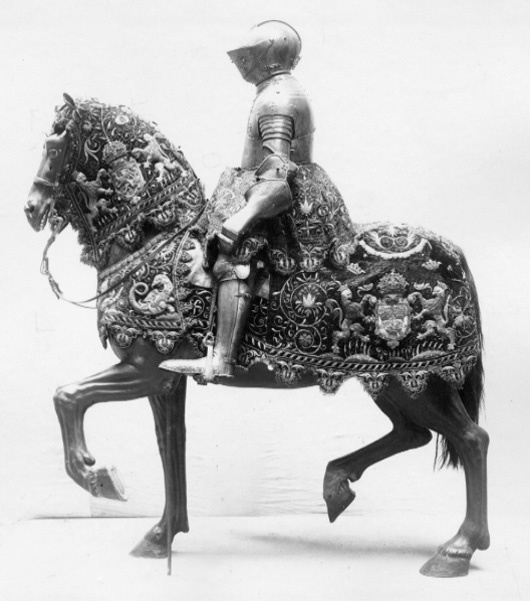 - a) Konung Gustav II Adolfs: 1 Tornerhästtäcke af svart sammet, med guldbroderadt perlstickarearbete, bestående af en halskappa med smala, till större delen utnötta guldfransar omkring och på ena sidan ett lejonvapen, båda på rdöt atlas; 1 Bringstycke med guldfransar samt ett Vasavapen; 1 stort Ländstycke i 2ne delar, på en asidan ett broderadt vapen med tre kronor och å den andra sidan ett vapen med lejon på blått atlas med guldfransar rundtomkring /allt murket och sönderfallet/; derpå sittande en karlfigur med förgyldt bröst- coh ryggharnesk, do do armstycken, 1 handske, 1 Höftstycke, förgyldt på kanterne, 2 förgylda lårstycken, 2 do benstycken med fötter och sporrar, 1 do ringkrage och 1 sluten hejlm, fodrad med karduan.