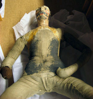 - Konung Gustaf II Adolphs: häst af papp på fotställning af träd med 1 spärrsadel, hvaraf framdelen af drifvet jern.