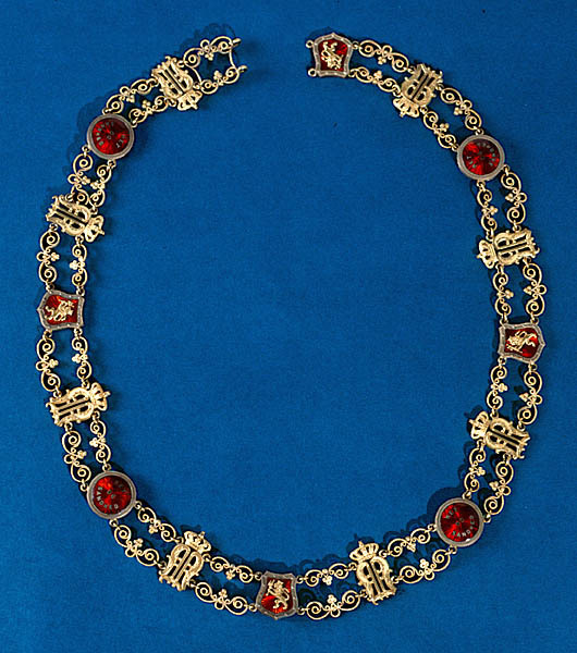 Kedja sammansatt av sexton länkar av guld och röd, genomsynlig emalj. Fyra länkar i form av franska sköldar med bred kulprydd kantbård, röd emalj, därpå fäst ett krönt yxbärande lejon av guld. Fyra runda, välvda länkar med bred guldkant, röd emalj, däri guldtext: "RET // OG// SANDHED". Åtta länkar i form av Oskar II:s krönta namnchiffer, anglosachsiska O:n samt II. Länkarna förenade med två genombrutna slingornament av guldband med repstavskant på överkanten, de nedre slingorna något bredare än de övre. Länkarnas baksidor lika framsidorna med saknar emalj, namnchiffrens, anglosachsiska O:n samt II. Länkarnas baksidor lika framsidorna, men saknar emalj, namnchiffrens baksidor släta. Ihopfästning med två hakar.