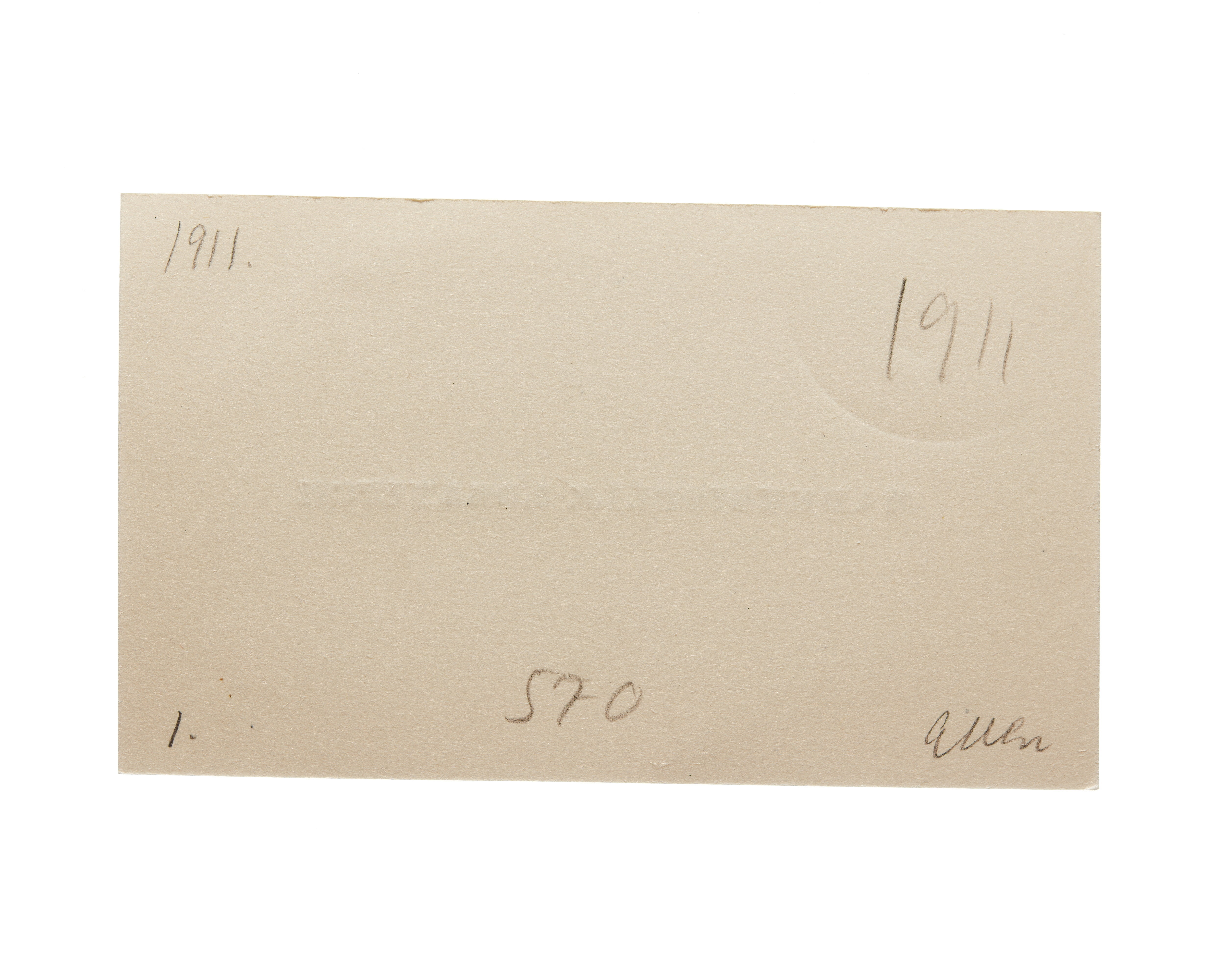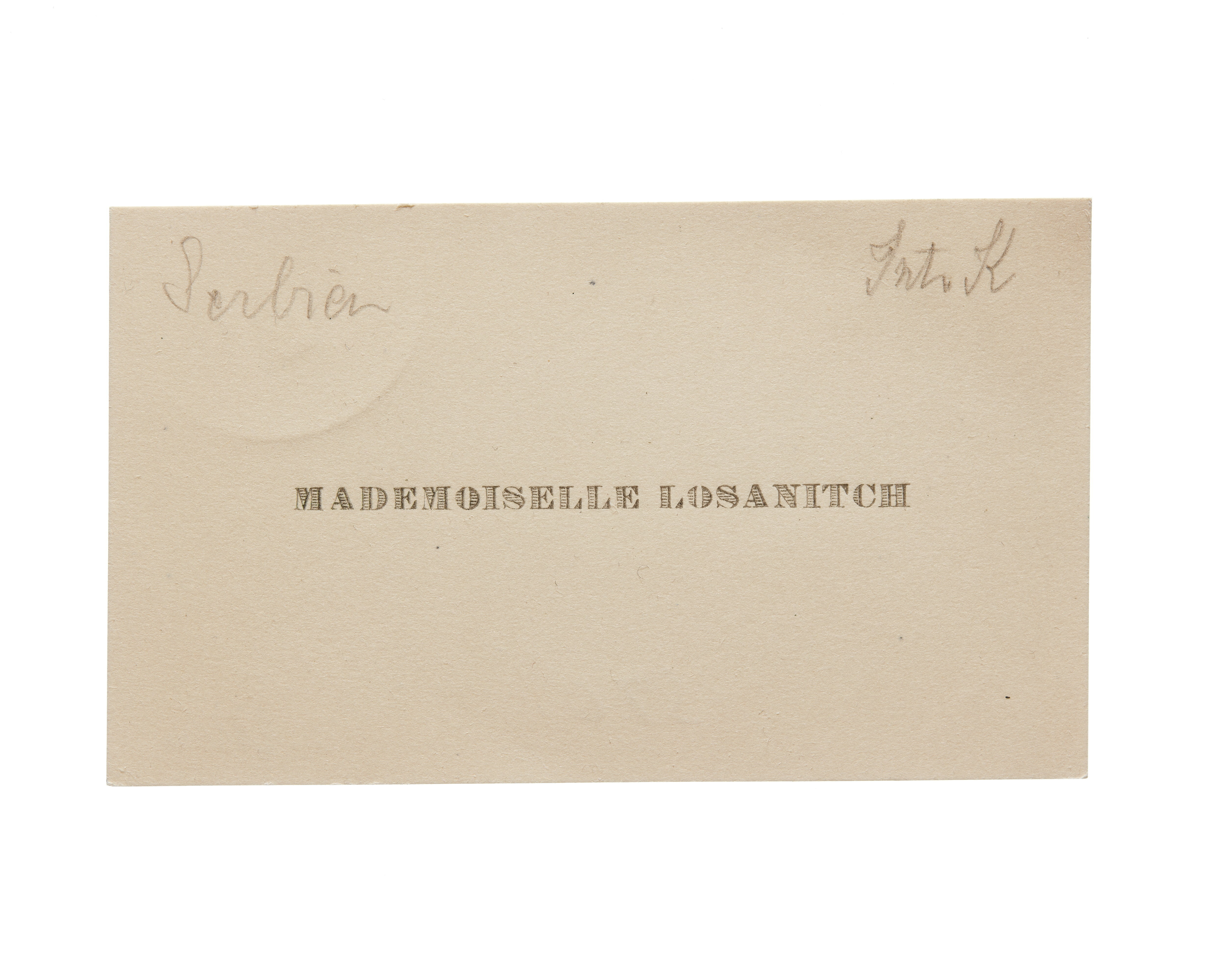 Ett visitkort från Mademoiselle Losanitch, daterat 1911. Adress (Handskrift, övre vänstra hörnet) serbian. Överlämnat i samband med Internationella kvinnoförbundets kongress i Stockholm 1911.
