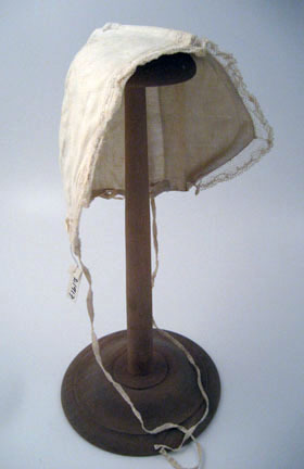Vit barnmössa av lärft (linne?) med spetskant, 12 mm bred, samt en 6 mm bred broderad dekoration i form av en stiliserad blomsterslinga längs de främre kanterna. Mössan är sydd i två delar med ett bakstycke och ett framstycke som förenas av en söm som löper över bakre delen av hjässan, från öra till öra. Förstärkning fram i form av dubbelt tyg, 59 mm bred i mitten upptill. 3 mm breda knytband är fästa bak i nederkanten i ett flätliknande mönster, för att knytas under hakan. Knytbanden går på grund av flätningen att spänna. Långa knytband.