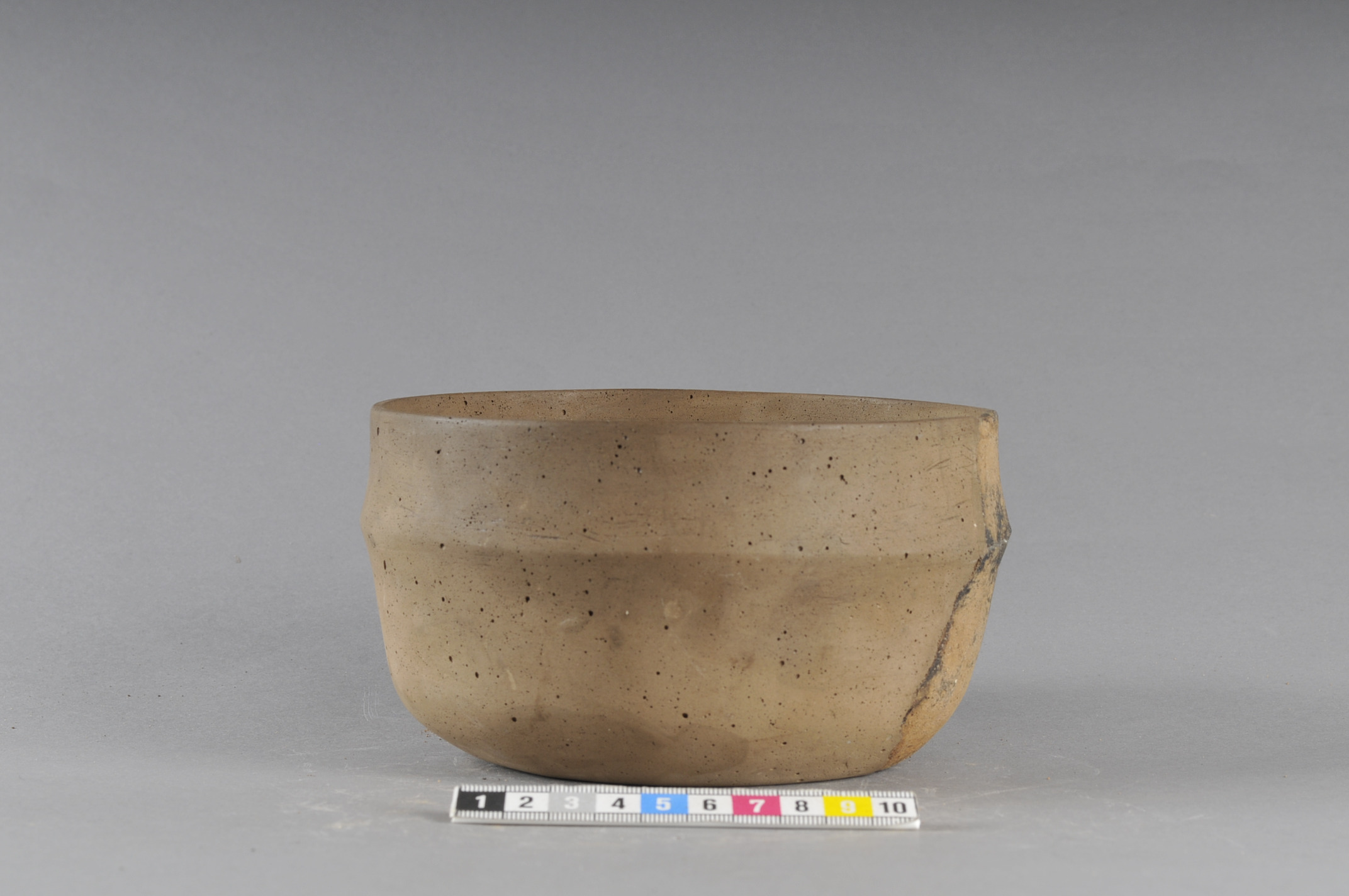 Grovt rekonstruerad skål med svagt indraget halsparti. ytan är slät och godset är sandblandat.
