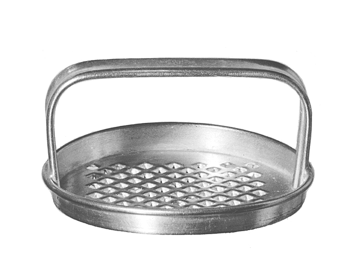 FISKFJÄLLAR Av bleckplåt. Rund, med rakt uppvikt låg kant, kring brädden en utstående stav, samt med rakt uppstående handtag; i botten ett fyrsidigt rivjärnhugget fält; handtag av platt skena med rakt nedböjda ändar och invikta flackstaviga kanter, ändarna fastlödda på den uppvikta kantens insida. Höjd med handtag: 4,6 cm.; diameter: 8,5 cm.