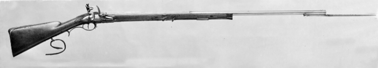 Flintlåsbössa, 1760-tal, pipan ej samhörande med övriga delar. Utfällbar bajonett.