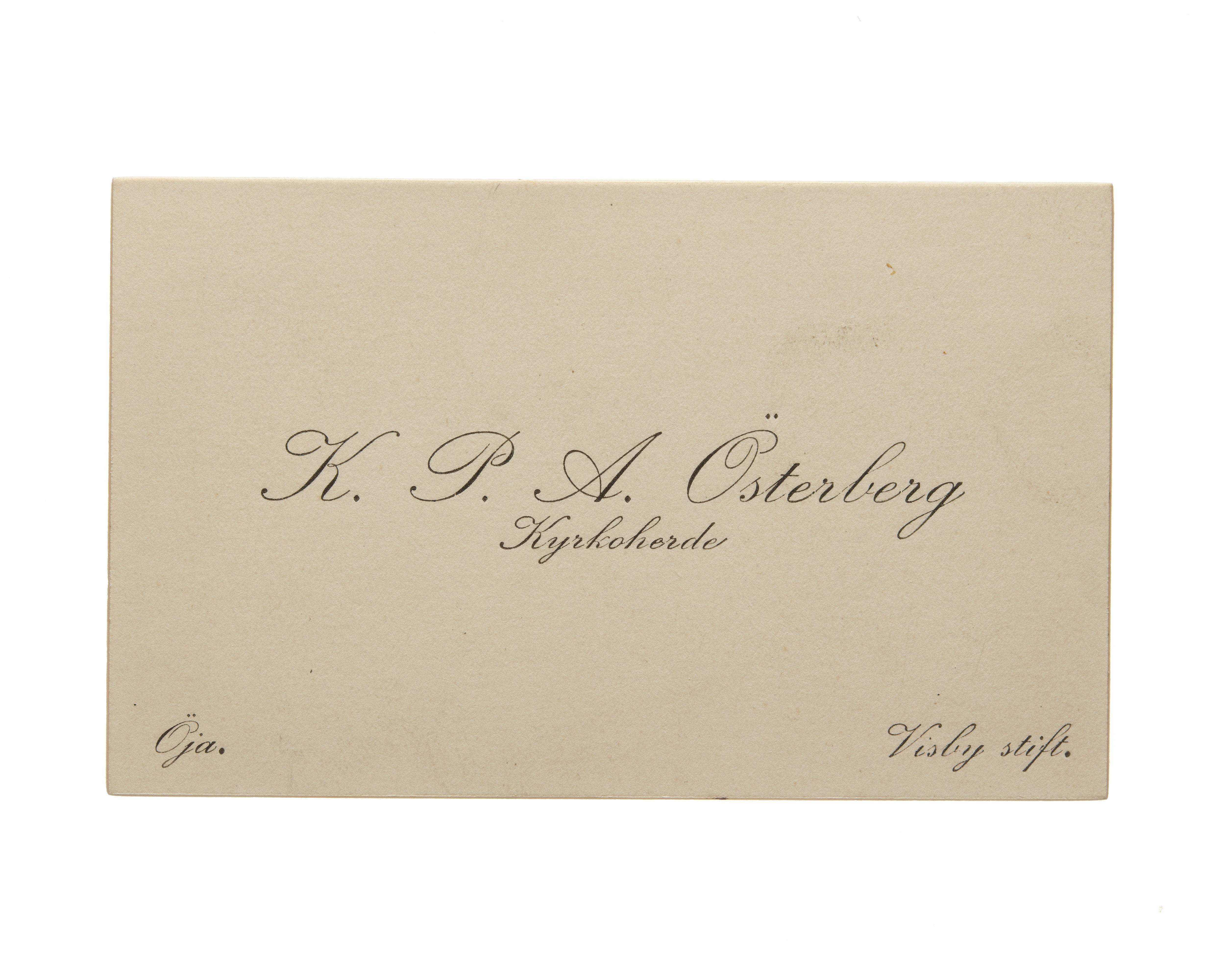 Ett visitkort från Kyrkoherde K. P. A. Österberg, utan datum. Adress (nedre vänstra hörnet) Öja. (nedre högra hörnet) Visby stift.