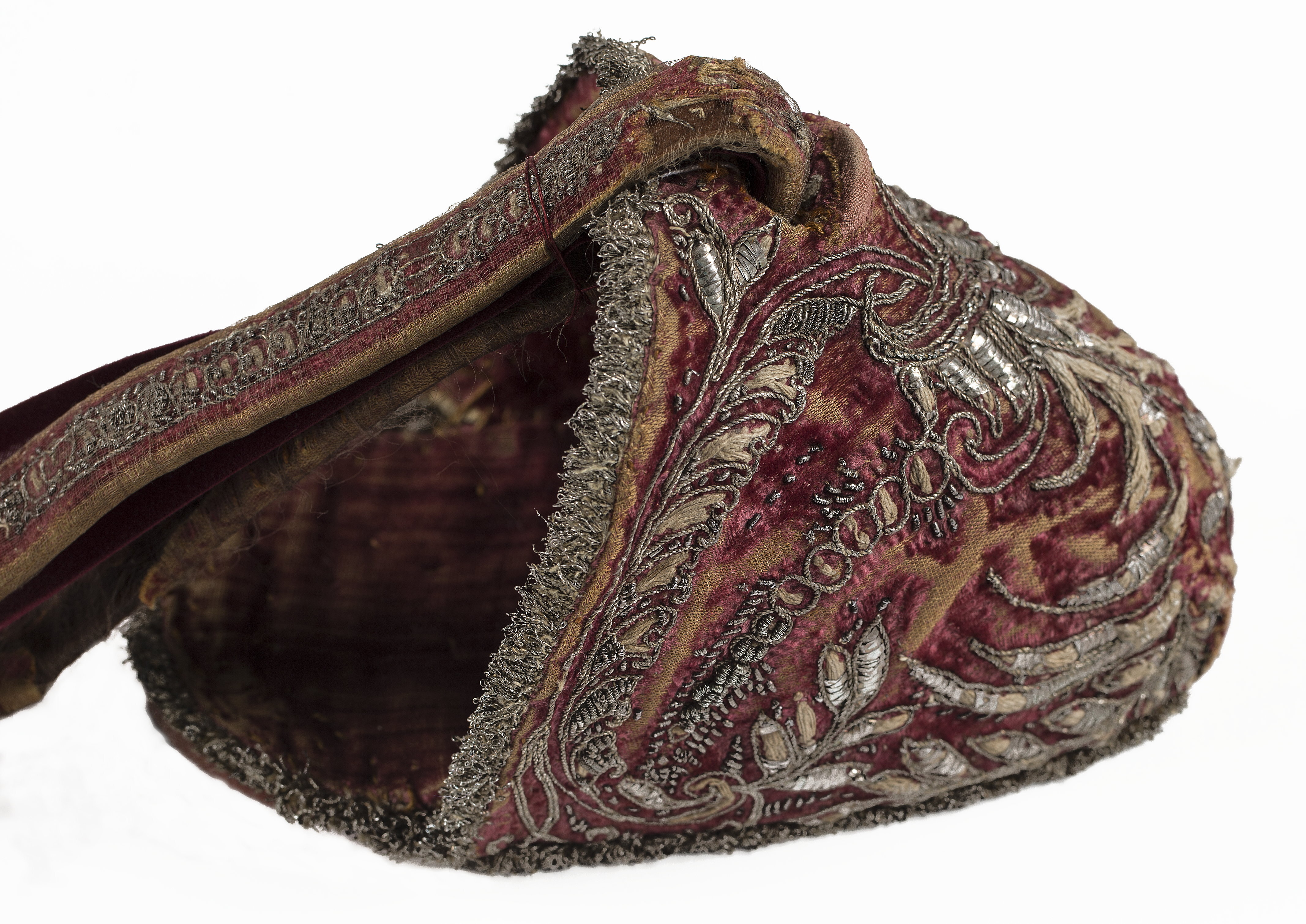 Tåskydd överklätt och fodrat med rött sammet på utsidan med broderier med silvertråd och lan i form av rankor och palmetter. Ovalt trampstöd klätt med röd sammet.
