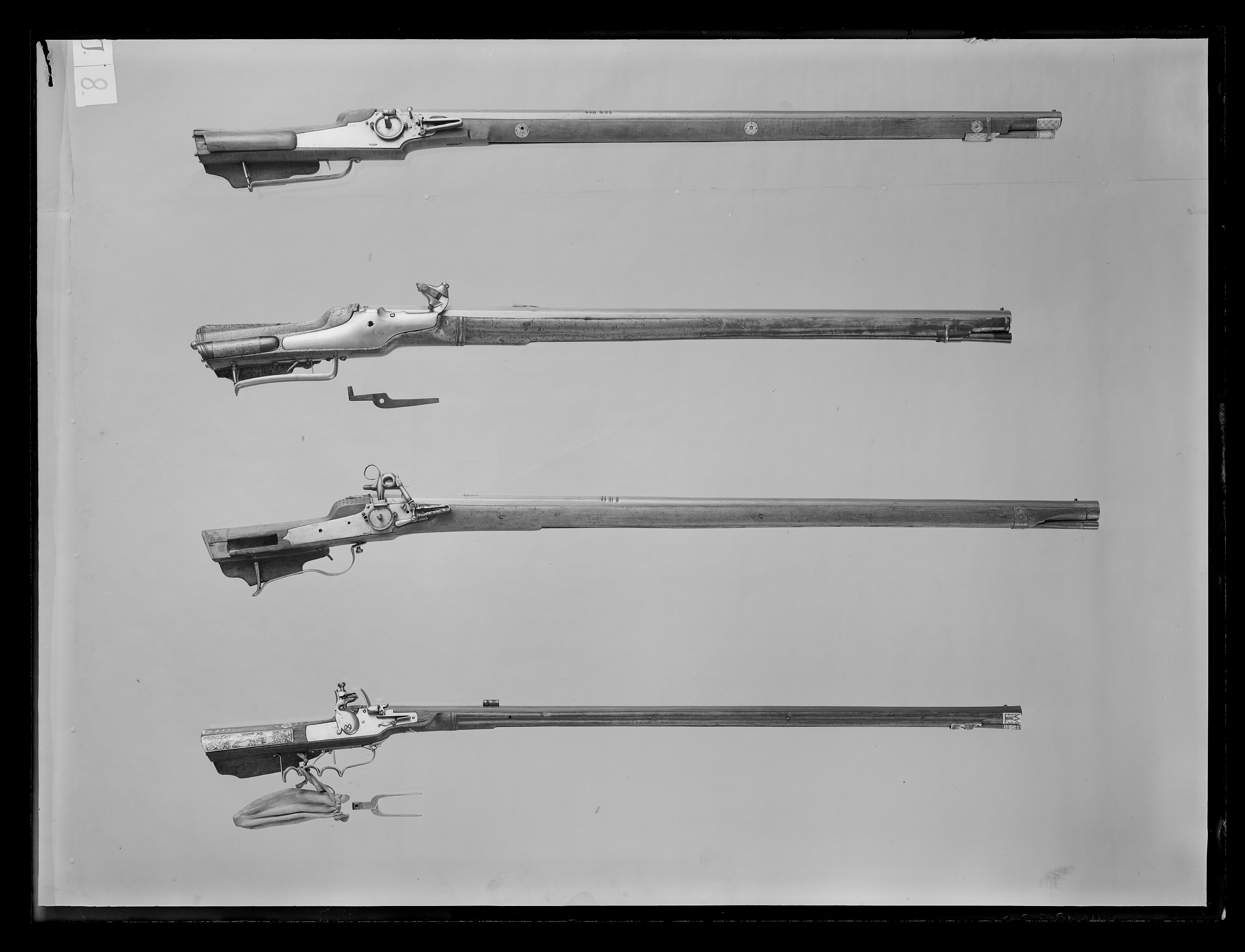 Rund, slätborrad pipa med åttsidig kammare, avslutad med punsad stjärna på varje fas, sex tvärgående band vid övergången. Långt, svagt böjt, rektangulärt svansskruvblad. Framför och bakom laxningen för siktet (saknas) tre punsade stjärnor. Vid kammarens början spår av punsade ringar, stjärnor och linjer. Riktmedel: Stolpkorn av koppar. Fästning: Tre häften. Pipan fäst med krysskruv underifrån (varbygelskruven) samt ett (urspr. tre) pipstift av trä. Hjullås med plant, odekorerat låsbleck av tysk typ. Utvändigt hjul fäst med ring och skruvar kl. 3 och 9. Fängpanna med rundad framkant, streckdekor. Låg krutskärm, rund tryckknapp. Hanen saknas. På låsets insida på hjulstudeln åtta vertikala streck ingraverade. Fästning: Två låsskruvar. Kort, rak avtryckare. Brun helstock av trä (bok ?) med kolv av tysk typ med vinge och kolvlåda. På den snidade vingen och på kolvryggen samt på sidorna om svansskruvbladet plattor av ben med blad-och flätbandsdekor. Kolvlådelock av trä. På stocken under kammaren inbränt: B. Beslag: Bakplåt av stål, tre små stödkulor av stål. Låsskruvbrickorm, pipstiftbrickor, näsband och överrörka av ben med blomdekor. Överrörkan fasthållen med smalt mässingsband runt socken. Rak, trågformig varbygel, främre skruven krysskruv. Tillbehör: Laddstock av trä, l: 1115 mm, benskoning, l: 30 mm med streckdekor. Nedtill ett invändigt gängat stålbeslag, l: 168 mm.