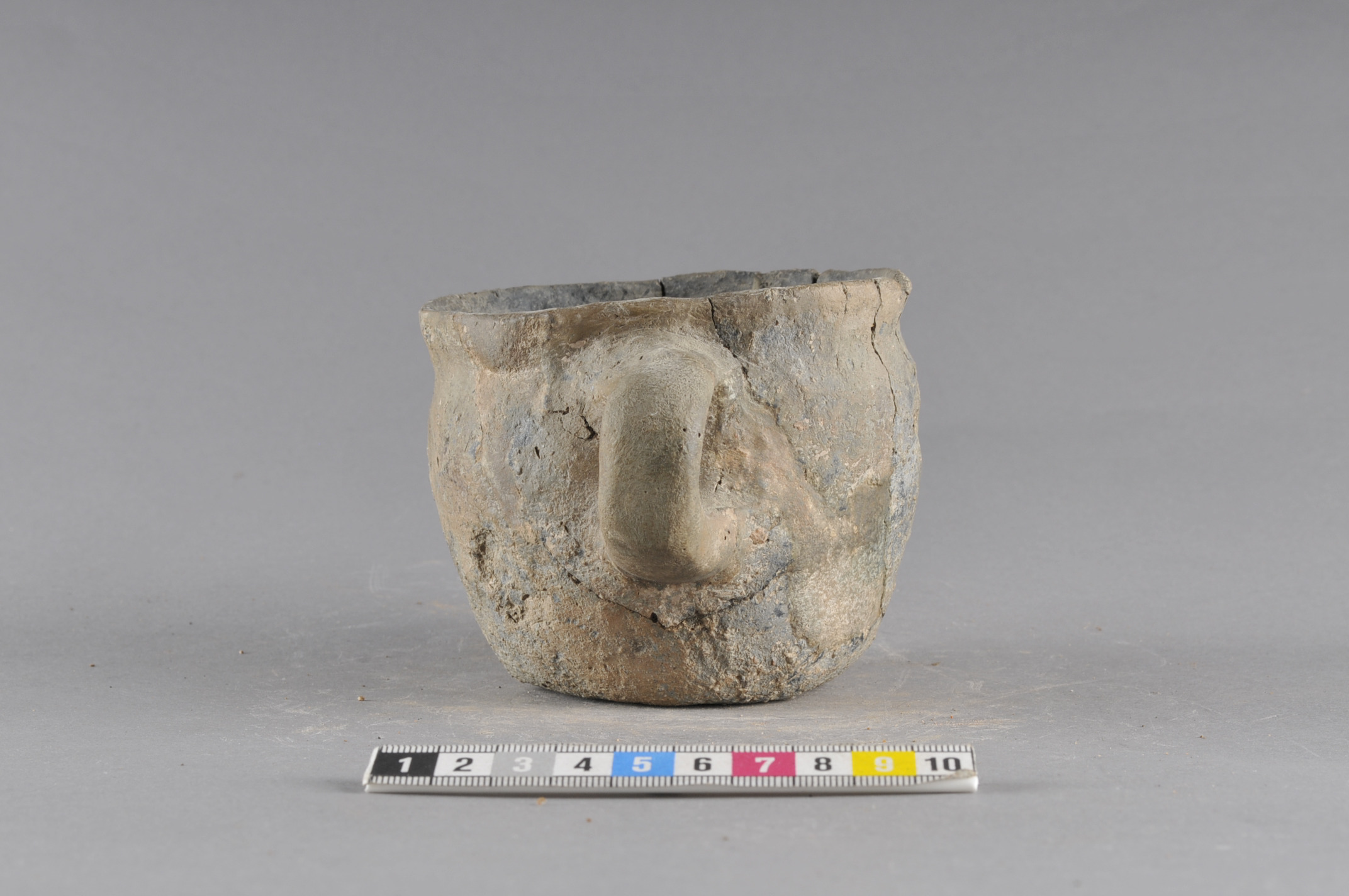 Lerkopp med hänkel. Mynningen lätt utsvängd. Ytan är avstruken och godset är tämligen hårt och har grövre magringskorn.