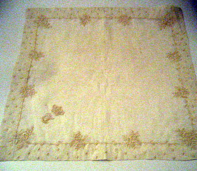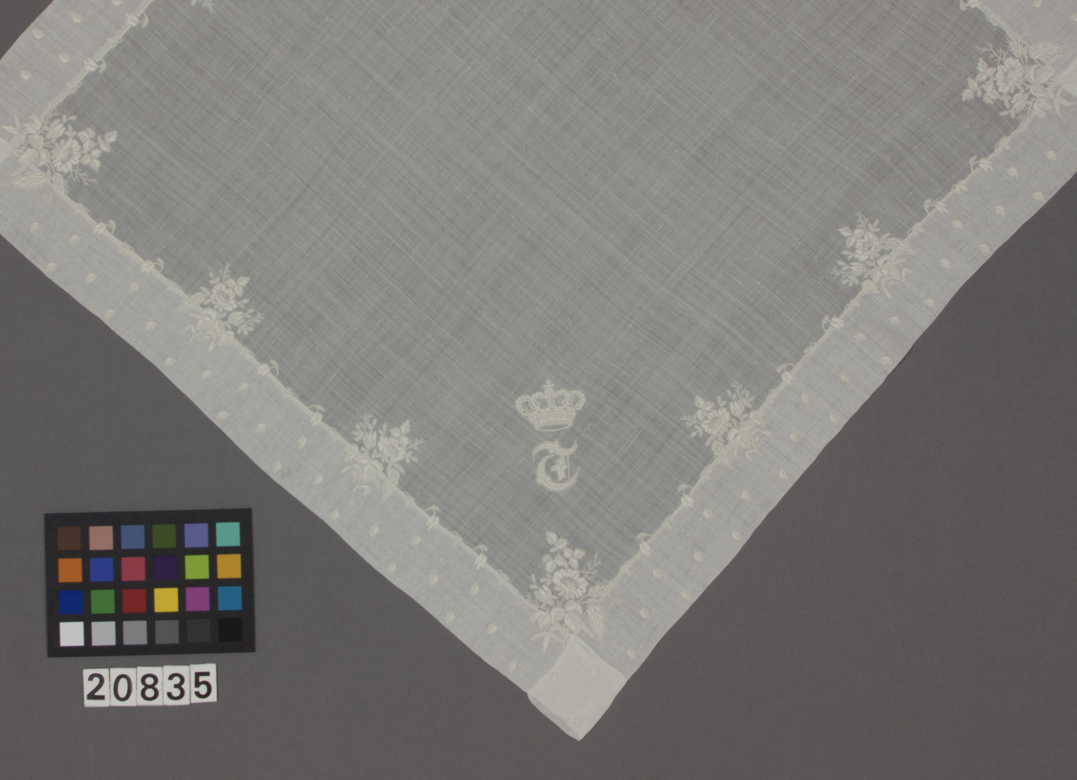 Kvadratisk näsduk av vitt linne. En bred fåll, 30mm, på vilken har broderats små löv. Runtom fållen ett broderi av vita blomsterkvastar i plattsöm. I ena hörnet ett vitt broderat monogram "T" under kunglig krona.