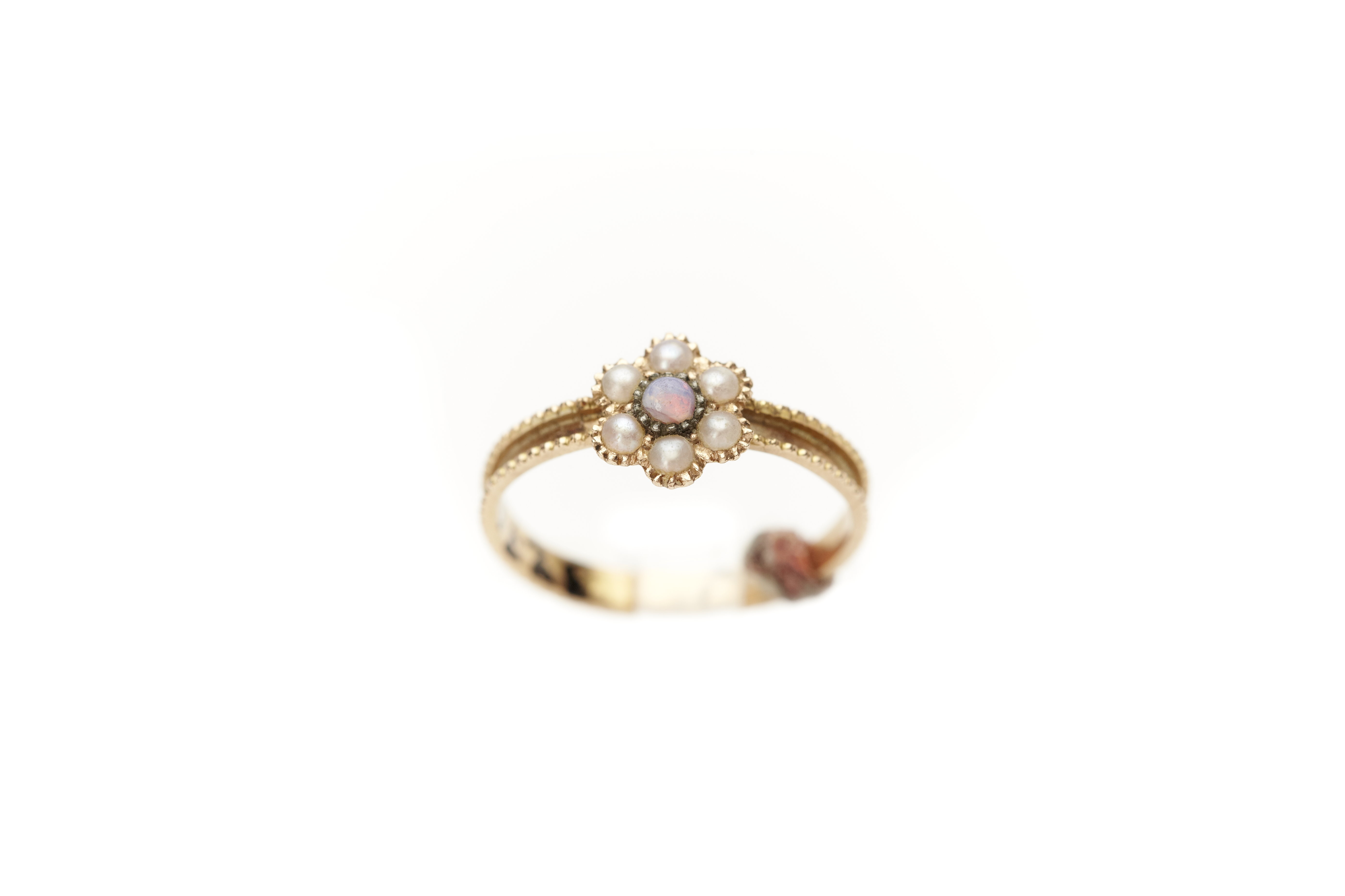 Liten ring av guld med rosett bildad av liten månsten omgiven av sex små pärlor.