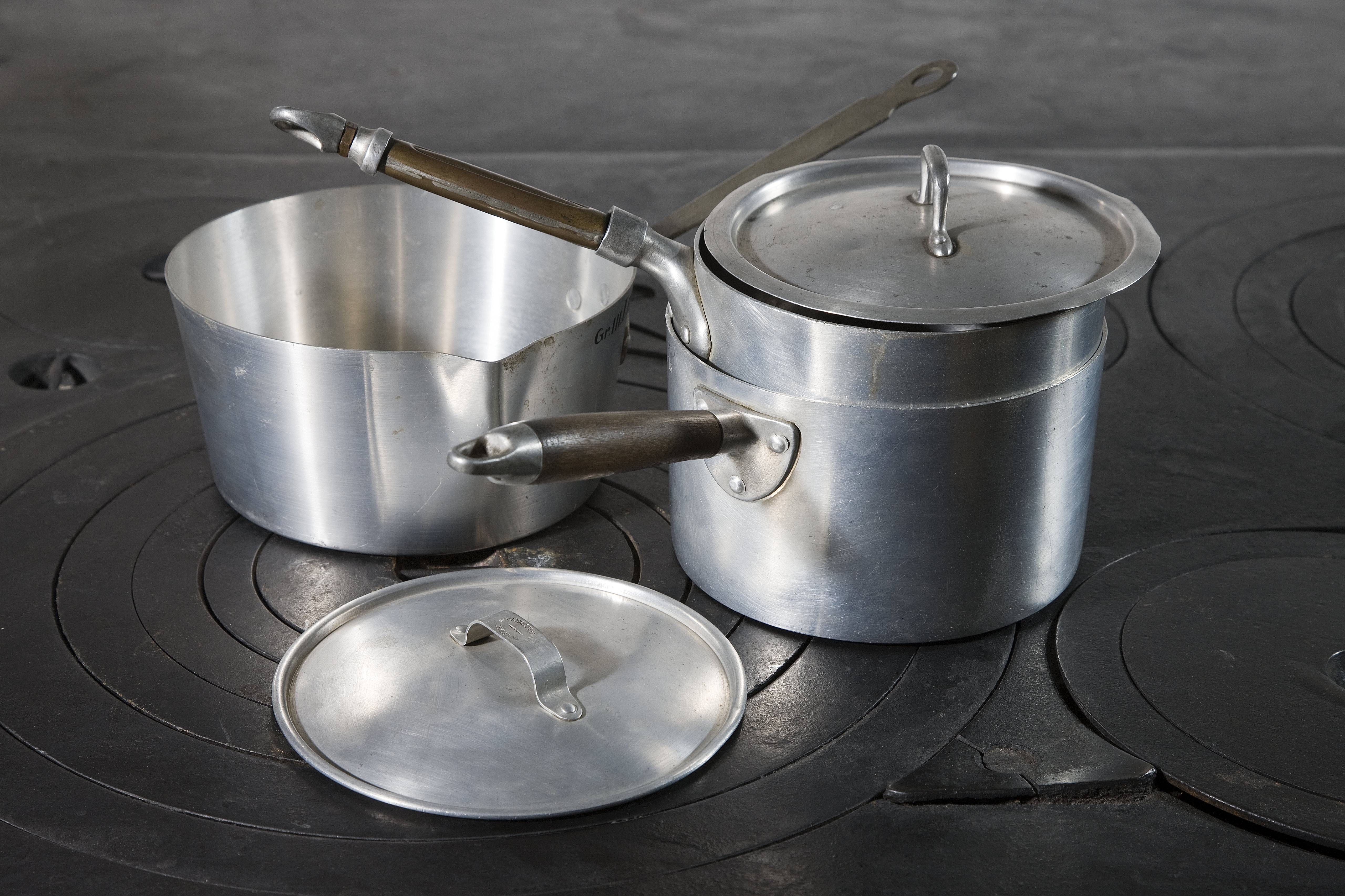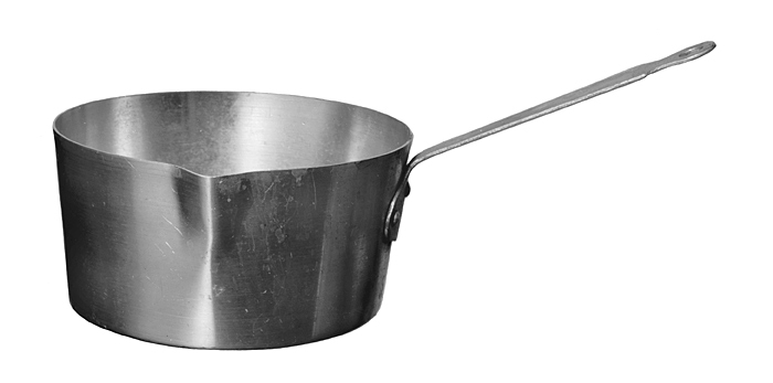 KASTRULL Av aluminium. Omvänt konisk, med plan botten, liten snås och snett utstående skaft. Snåsen till vänster om skaftet samt trubbvinkligt utvikt. Skaft av järn, platt, avsmalnande inåt, yttre änden rundad och insvängd från kanterna, i denna ett ovalt hål, från inre änden utgående en nedvikt, liggande oval flik, fäst vid kanten med tre nitar. Till höger om skaftet inslaget numret 17. Höjd: 8,5 cm.; diameter: 16,9 cm. Skaft, längd: 16 cm.