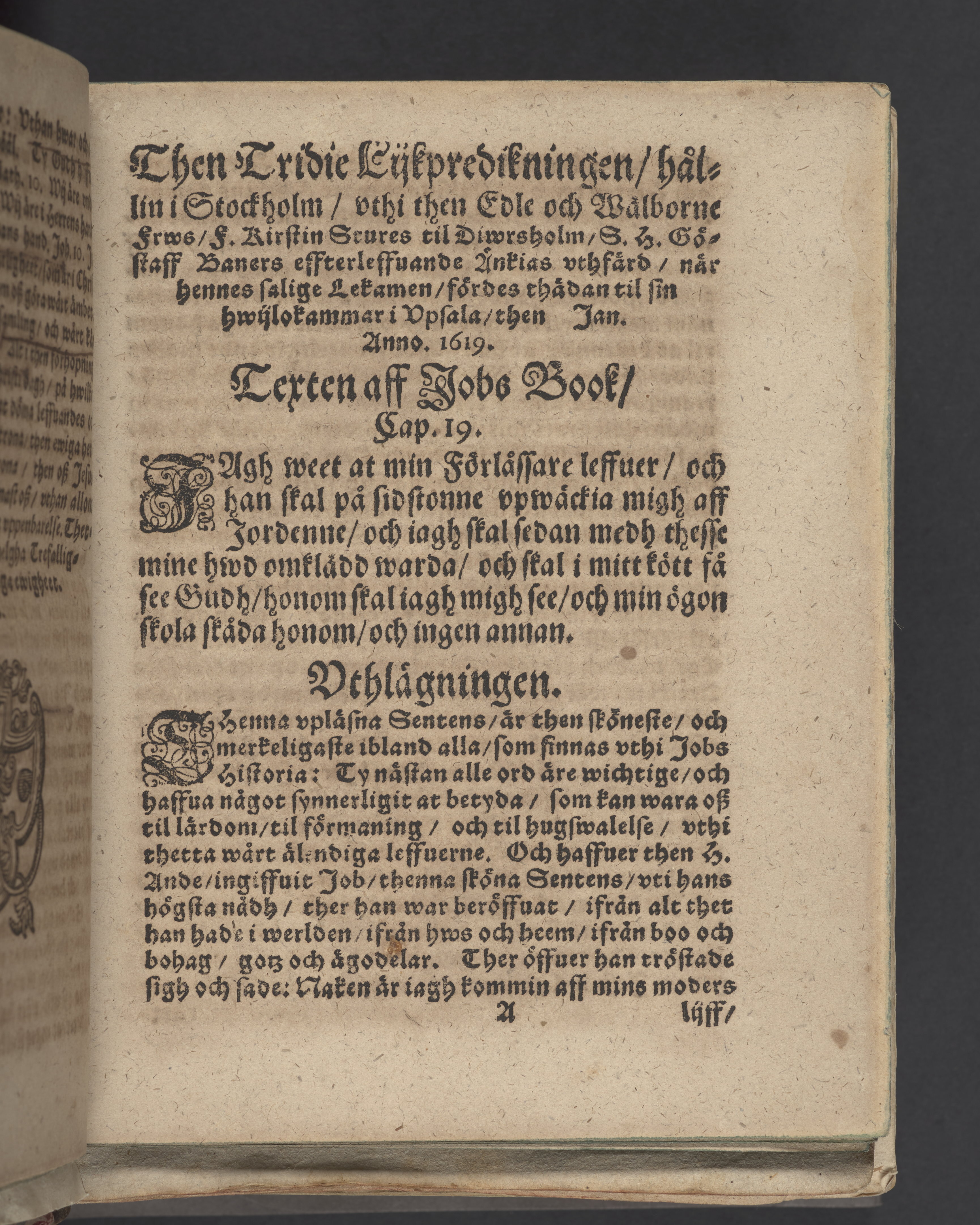 Then tridie lijkpredikningen, hållen i Stockholm, vthi F. Kirstin Stures til Diwrsholm, S. H. Göstaff Baners effterleffuande änkias vthfärd ... til sin hwijlokammar i Vpsala, then [~] jan. anno 1619.