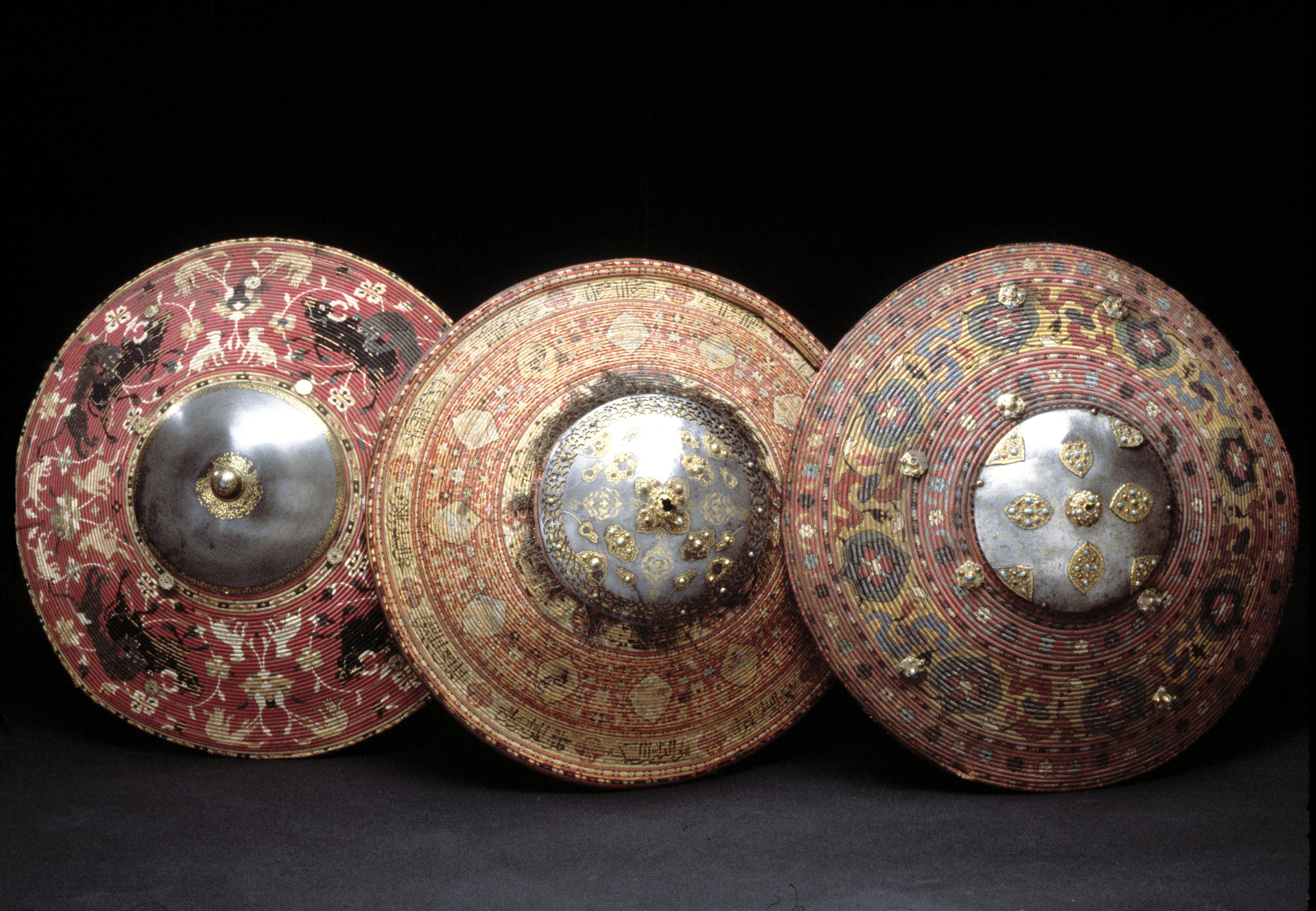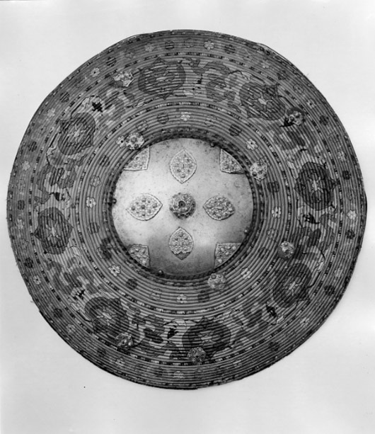 Rund välvd sköld av vidjor lagda koncentriskt, överspunna med silke i olika färger så att stiliserade växtmönster bildas, intill mitten och kanten mot röd botten, däremellan mot gul botten. På mitten en rund välvd sköldbuckla av stål, ca 215 mm i diameter inlagd med fina rankor av guld. På bucklan fyra spetsovaler, längs kanten fyra halva spetsovaler och mitt på en 25 mm hög knapp av stål, alla beslagna med pressade och ciselerade guldbleck och inlagda med röda och turkosa stenar. Runt bucklan sticker en sick-sack-klippt kant av ylletyg fram. På skölden sitter dessutom åtta (ursprungligen tio) rosettformade nitbleck av stål beslagna med pressade och graverade guldbleck och med inlagda röda och turkosa stenar. Sammanlagt finns det 64 turkoser och 62 röda stenar i olika storlek på skölden. Skölden är kantad med svart läder över en ståltråd. Fodrad med grön sammet. På mitten en fyrkantig stoppad kudde, klädd med samma tyg. Över denna bärsnoddar flätade i rött silke i kors fästa i ringar i rosettformiga nitar och förenade på mitten av en mässingsring. Två ursprungligen tre bärsnoddar av samma material är fästa i ringar i rosettformade nitar på sköldens baksida.