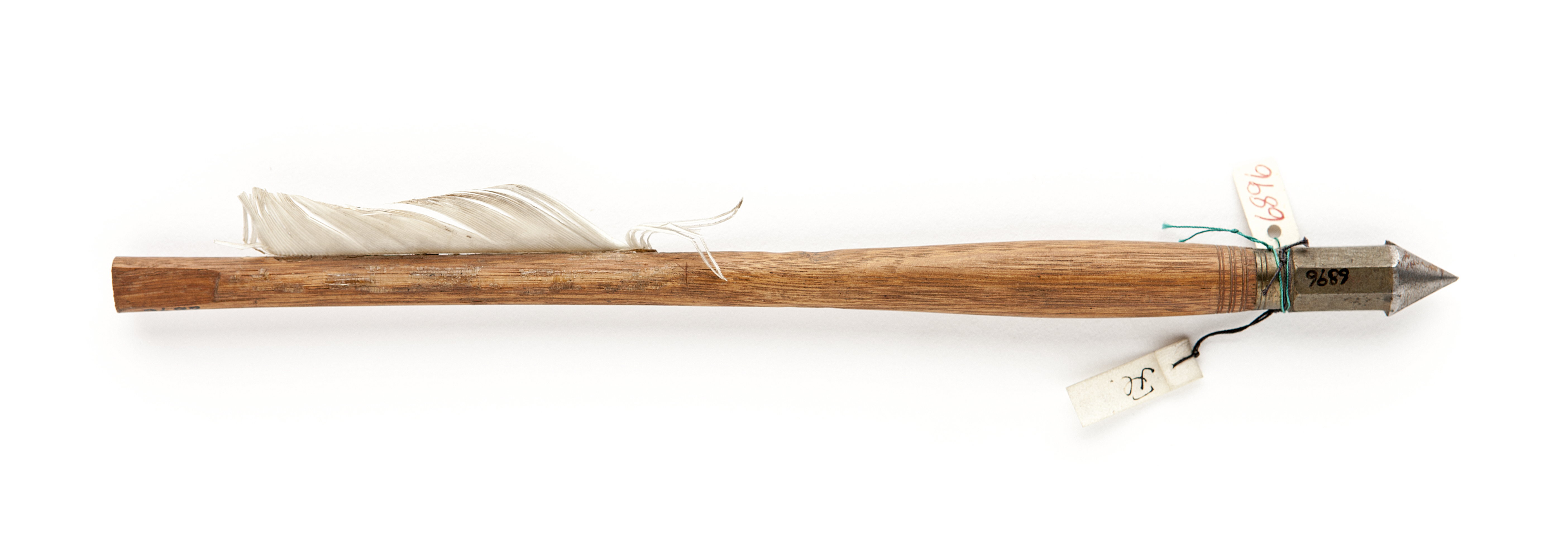 Cylindrisk, åttkantig, framtill konisk spets med ringformigt beslag. Cylindern och beslaget av mässing, spetsen av stål. Skaft av trä med runt tvärsnitt något spolformigt, baktill plant på två sidor med en vinge av vingpenna.