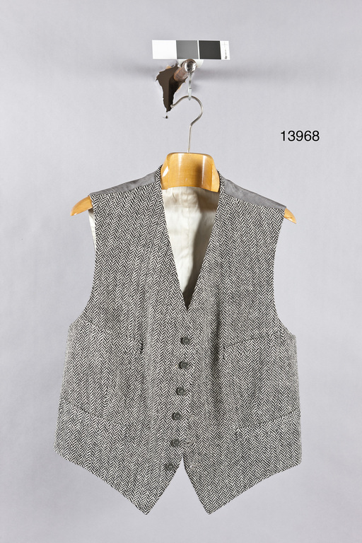 Väst av fiskbensmönstrat svart-vitt ylle, med rygg av grått siden. Knäppes med sex grå plastknappar, diam: 14 mm. På varje framstycke två fickor utan lock. I ryggen två spänntampar med en rektangulär, svart metallsölja. Foder av vit bomull. En innerficka med lock och knapp i varje framstycke.