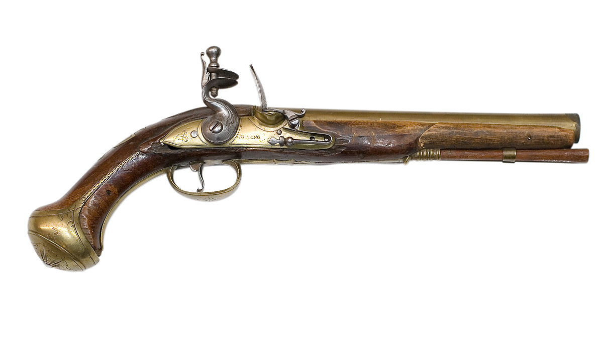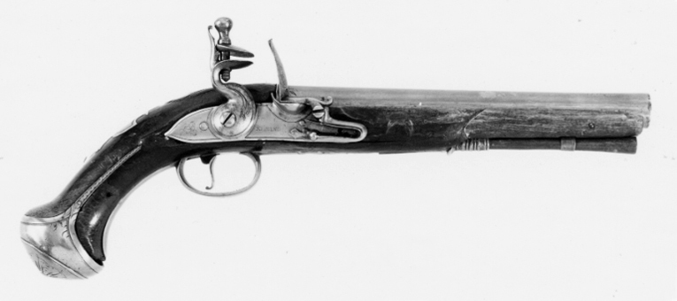 Rund, slätborrad pipa av mässing, på kammaren plan siktribba med graverad kantlinje ovalt ändblad, på ribban graverat: "LONDON", till v. därom Londonkontrollstämplar London View, C K krönt av öppen krona samt London Proof. Svansskruv av stål med svagt böjt blad med spetsig ände, enkel, graverad dekor. Fästning: Två häften av stål. Pipan fäst med krysskruv, bakre låsskruven i hak i svansskruvplattan samt två pipstift av stål. Flintlås med välvt låsbleck av mässing, graverade dubbla kantlinjer samt bakom hanen bladknippe, framför hanen: "KIPLING". S-formig, välvd hane av stål, graverad bladranka. Runda käkar, omvänt päronformigt käkskruvhuvud. Rundad fängpanna av mässing med liten fals. Batteri med välvd eldstålsrygg och fängpannelock, s-formig häl med volutformig ände, batterifjäder med rombiskt löv. På låsbleckets insida stämplat: I F. Nöt utan studel. Fästning: Två låsskruvar. S-formigt svängd avtryckare. Helstock av trä (valnöt?) Enkel snidad dekor vid svansskruvbladet. Beslag av mässing, kolvkappa med långa flikar på kolvsidorna, graverade sicksackbårder, runt skruven en graverad sexbladig blomma samt en oval vulst. Konturerad, sköldliknande tumplåt. Sidbleck i form av band- och rankverk med graverade detaljer, vid bakre skruvhålet ett odjursansikte. En profilerad spetsrörka med lång, smal spets. Främre rörkan ersatt av smalt mässingsband. Tillbehör: Laddstock av trä, L: 203 mm