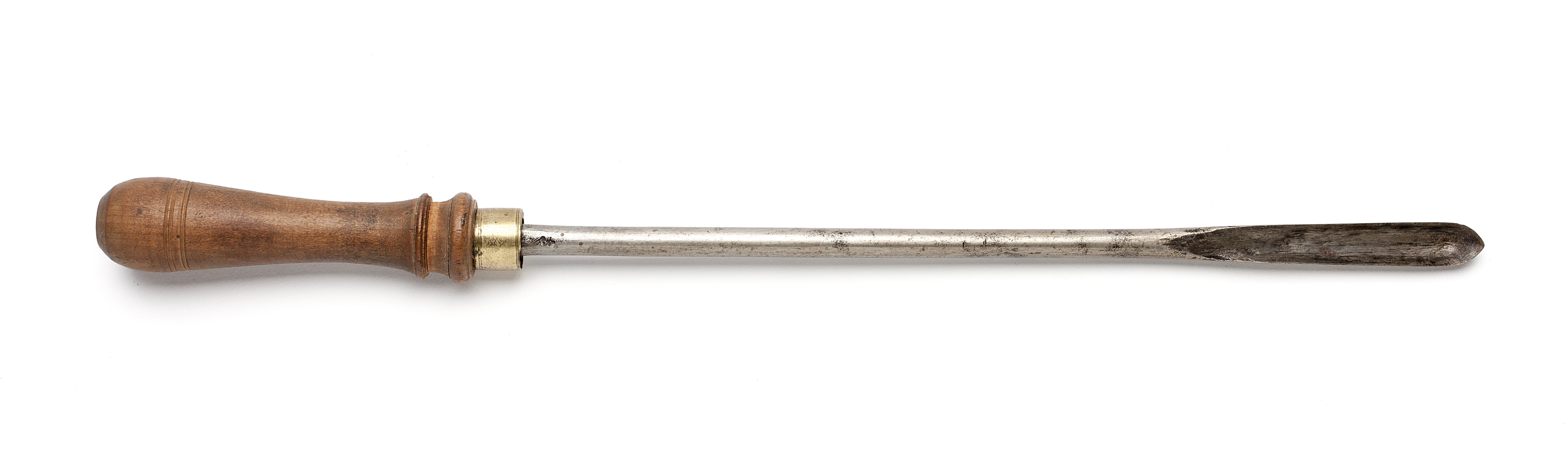 Rund klinga. Spetsoval egg. Stämplat på stålet: hjärta under kors. Svarvat skaft av päronträ, med två vulster nedtill ("rydboholmstyp"). Mässingsring.