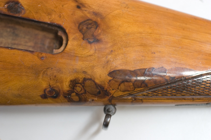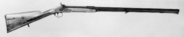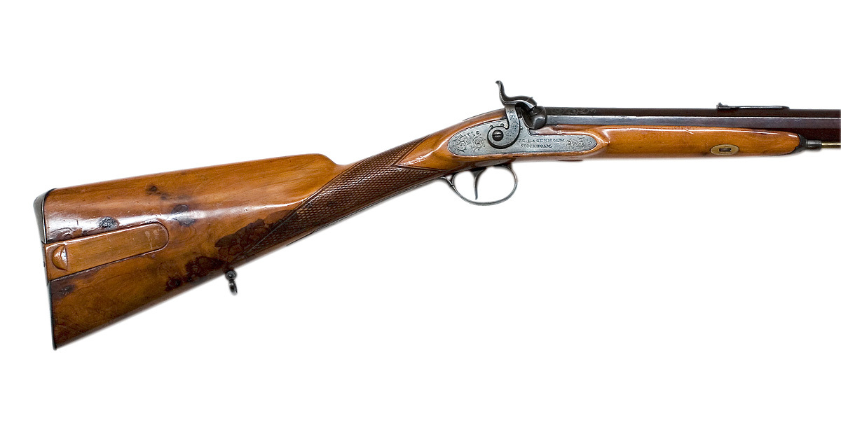 Åttsidig, blånerad, räfflad pipa, plana räfflor. Baktill förlängd 16 mm med obrunerad del med spiralformig snäcka, blånerad nippel, svagt böjt svansskruvblad med smalare ändblad. På förlängda delen och svansskruvbladet graverad rankdekor. På den brunerade delen baktill på de tre övre faserna samt på båda sidor om siktet på övre fasen rankdekor av påslaget silver i relief. På pipans undersida två släta rörkor, på den bakre en rembygel. Riktmedel: Blånerat, fjädrande ståndsikte, l: 55 mm, fäst med skruv framtill, höjbart med skjutbar löpare i spår framför skärmen, gradering med 4 streck. Inlaxat korn av mässing på platta som är bredare än pipans överfas. Fästning: Ett häfte för engelskt pipstift. Pipan fäst med krysskruv ovanifrån, bakre låsskruven genom svansskruvplattan samt ett pipstift. Slaglås med plant låsbleck, graverad rankdekor i båda ändar samt på hanen. Platt hane med något fasade kanter, harmynt slaghuvud, nätskuret tumgrepp. Framför hanen graverad signatur: "P. G. LAGERHOLM // STOCKHOLM". Länk nöt-slagfjäder. Ringformig studel med två fästskruvar upptill för studeln, till h därom fästskruv för stångfjädern samt därnedanför fästskruv-axel för avtryckarstången. Fästning: En låsskruv. Svagt s-formigt svängd avtryckare med rundad framsida. Halvstock av ljust bredådrigt lövträ med flera kvisthål-lagningar dels vid kolvlådelocket sant på h sida vid rembygeln. Kolv med kindstöd och kolvlåda, kolvlådelock i flykt med kolvytan, halvmånformigt upphöjt grepp. Nätskuren kolvhals. Samtida (?) skarvning med annat trä ovanför låsbleckets främre del. Beslag av stål, kolvkappa med flik avsmalnande framåt i två avsatser, graverad rankdekor, två fästskruvar. Spetsrörka med profilerat rör framtill, spets med graverad rankdekor. Två ovala pipstiftbrickor av vitmetall (silver?, överlackade). Avtryckarbleck-underbeslag profilerat framtill med graverad dekor. På underbeslaget fäst varbygel med kluven bakre stolpe och lång bakre arm, graverad rankdekor, två fästskruvar. På kolvens undersida en rembygel av stål. Tillbehör: Laddstock av mässing, l 746 mm, framtill påträtt ett huvud, l: 30 mm, stocken invändigt gängad för krats i andra änden.